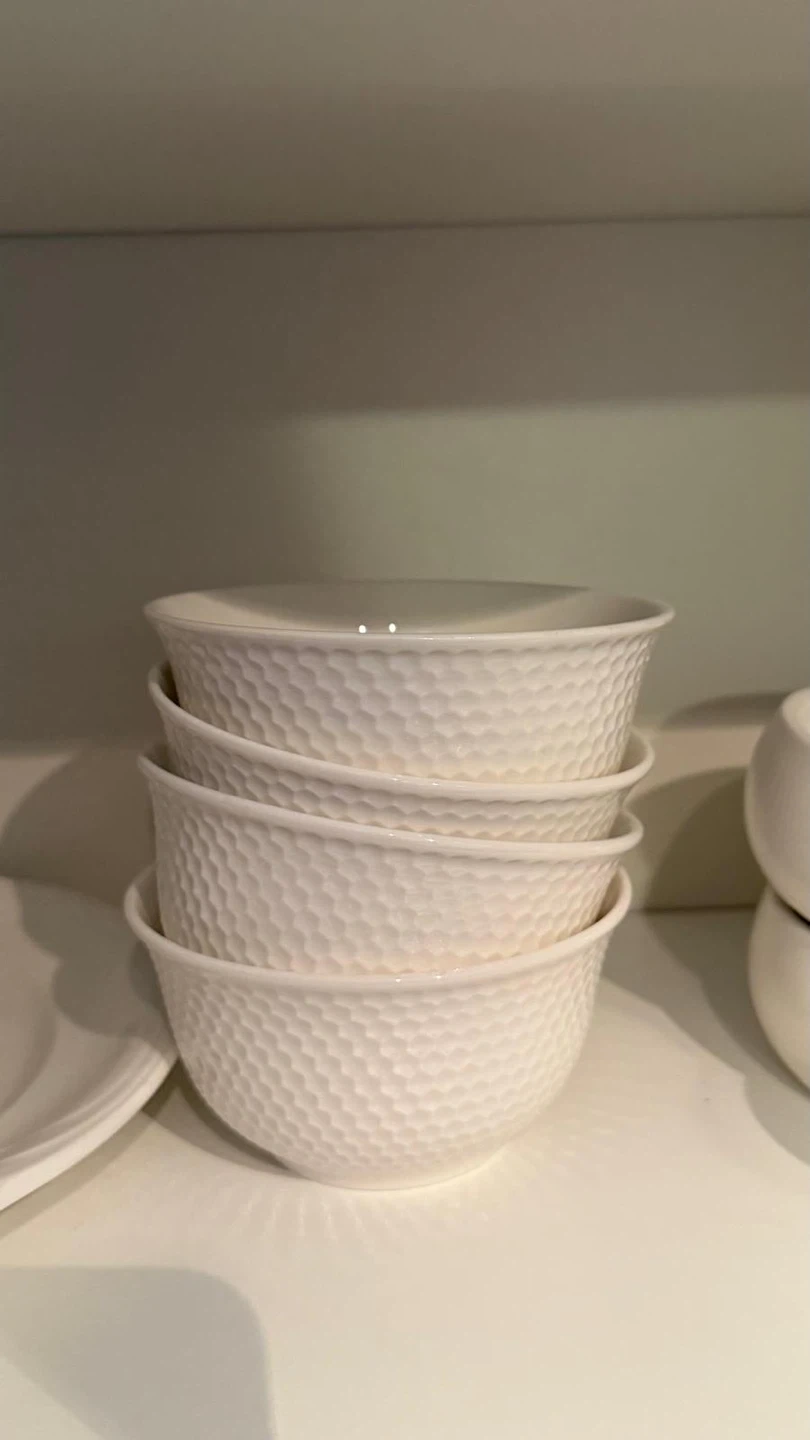 These are four white ceramic bowls with a honeycomb-like texture. They're good for serving snacks or small meals. Dishwasher and microwave safe.