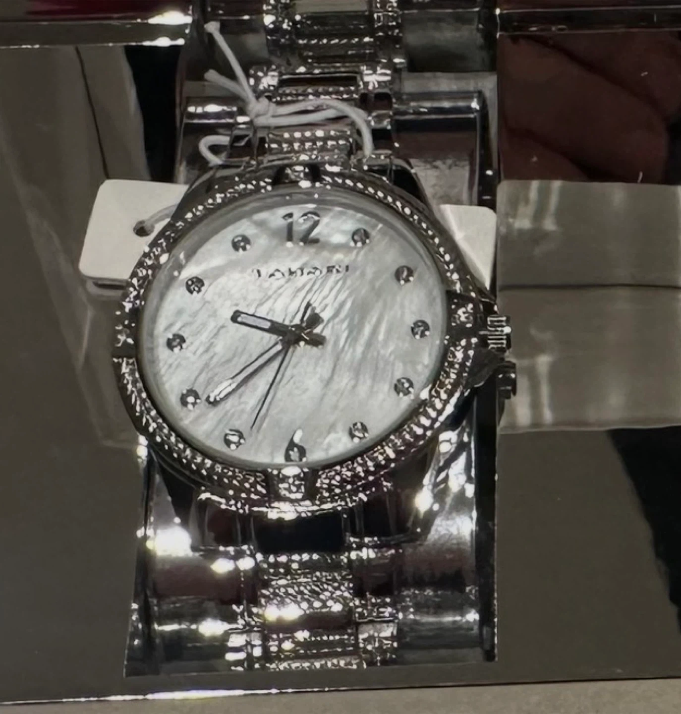 This is a Tahari women's watch featuring a silver-tone band and a mother of pearl dial. It comes in its original box. It's a stylish accessory for everyday wear.