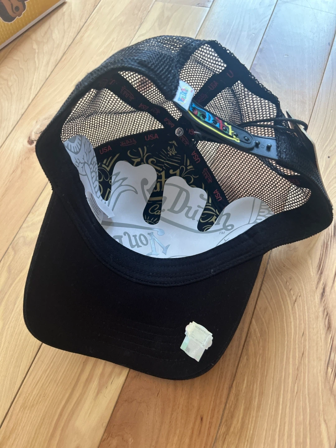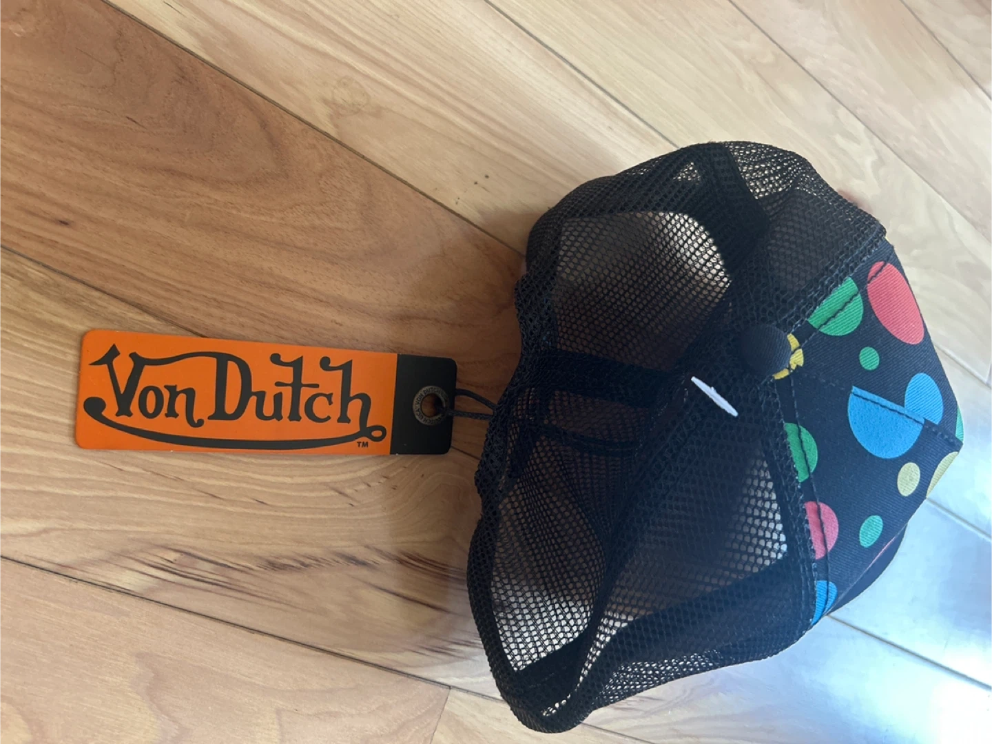 Selling a Von Dutch black trucker hat. It features a colorful polka dot design and the Von Dutch logo embroidered on the front. The hat has a mesh back for breathability and an adjustable snap closure for a comfortable fit!
