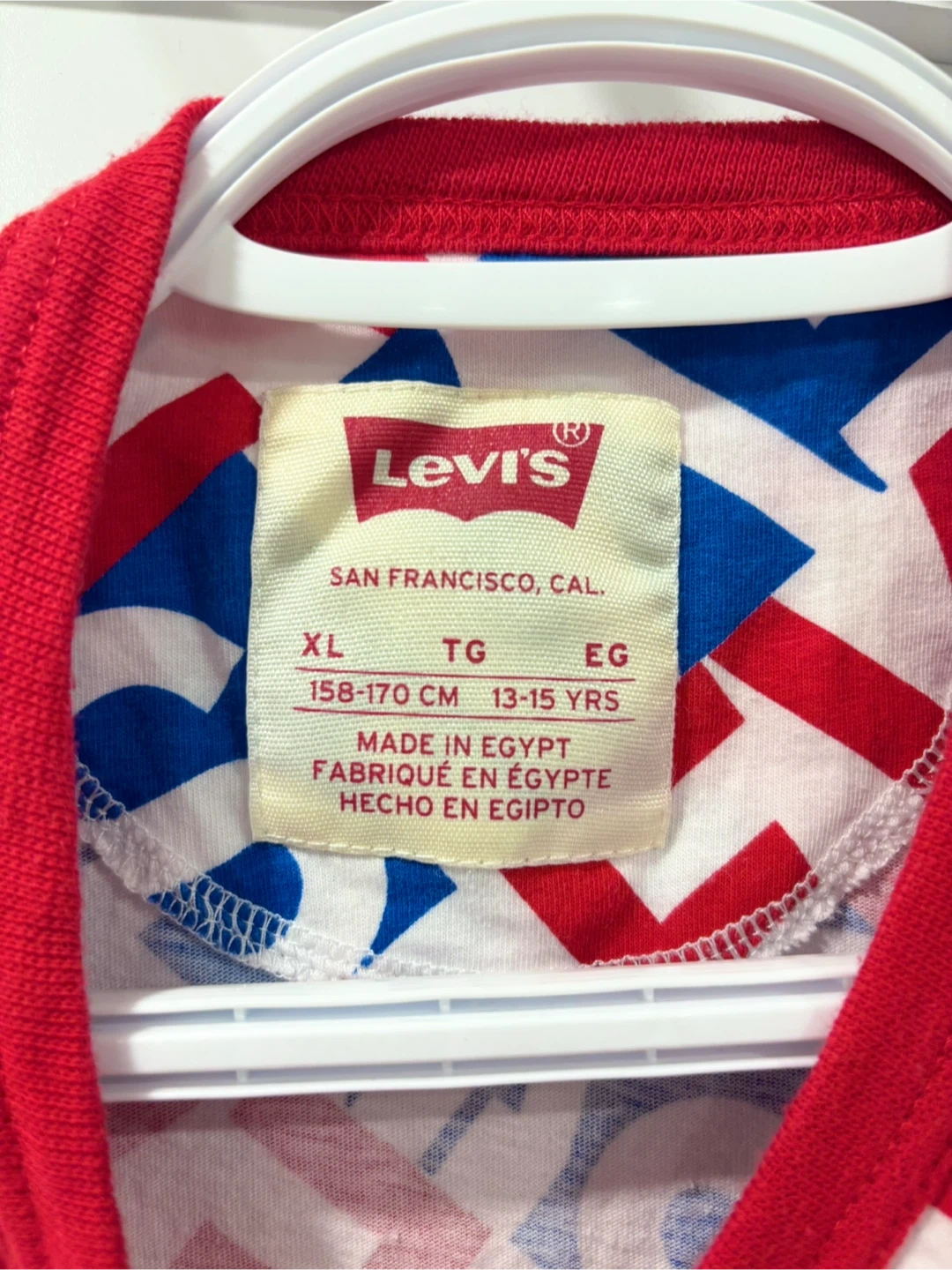 This is a Levi's t-shirt with an all-over logo print. Size XL, fits 158-170 cm or 13-15 years. Made in Egypt.
