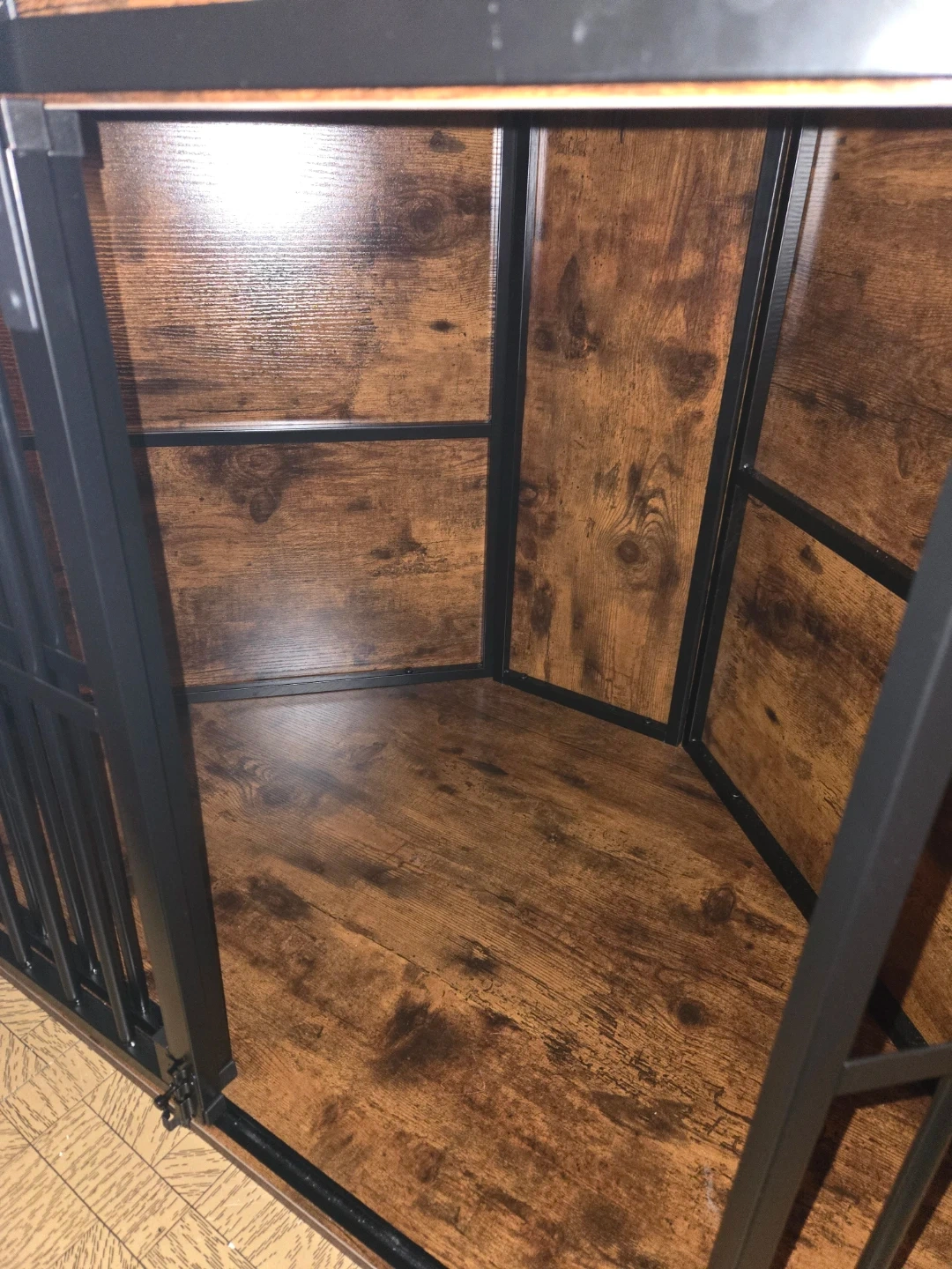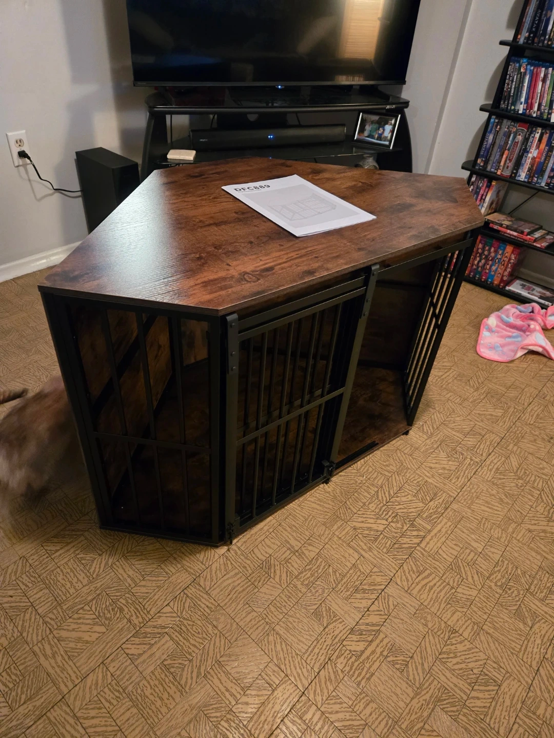 This is a corner dog crate furniture with a barn door design. It's made of particleboard and metal. The dimensions are 42" W x 26.8" D x 25.2" H. It's suitable for small to medium dogs.