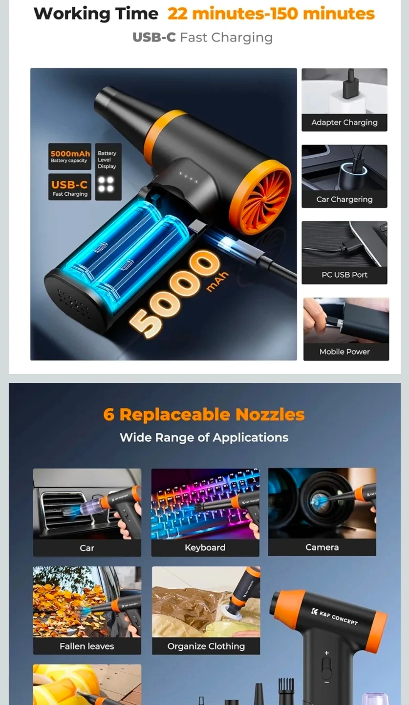 K&F CONCEPT 2-in-1 Compressed Air Duster with LED Light, 150000RPM Air Blower with Vacuum Cleaner, Speed Adjustable Rechargeable Compressed Air for PC Laptop Computers Keyboard Car Outdoors