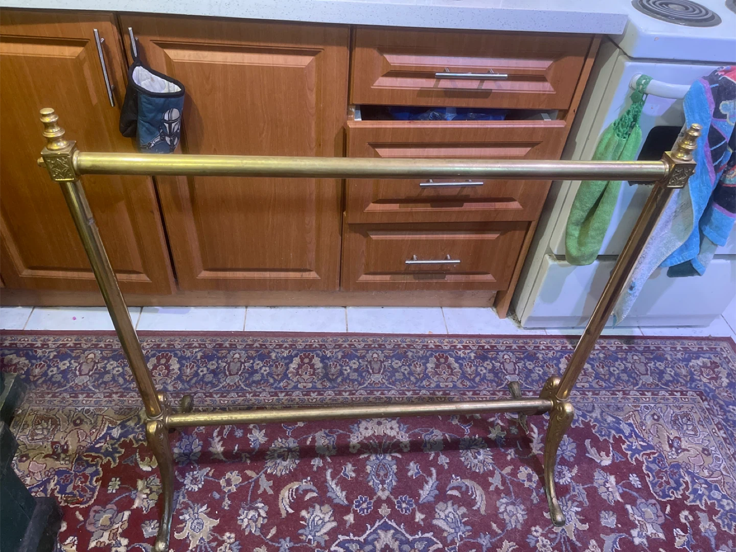 Buy & SellVintage Brass Quilt Blanket Stand Rack,Vintage Brass Quilt Blanket Stand Rack,$150Vintage Brass Quilt Blanket Stand Rack, Ornate Legs, 36" Long decorative detailing. It's a free-standing unit with elegant scrolled feet.WHERE TO MEETCheck LocationView MapSELLERverifiedJamesBloor Annex23913 reviews0 chats·3 favorites·19 viewsSEND CHAT TO SELLERHi James! I’m interested in your listing.Hi James! I’m interested in your listing.Get the Karrot app to chatSign In to chat