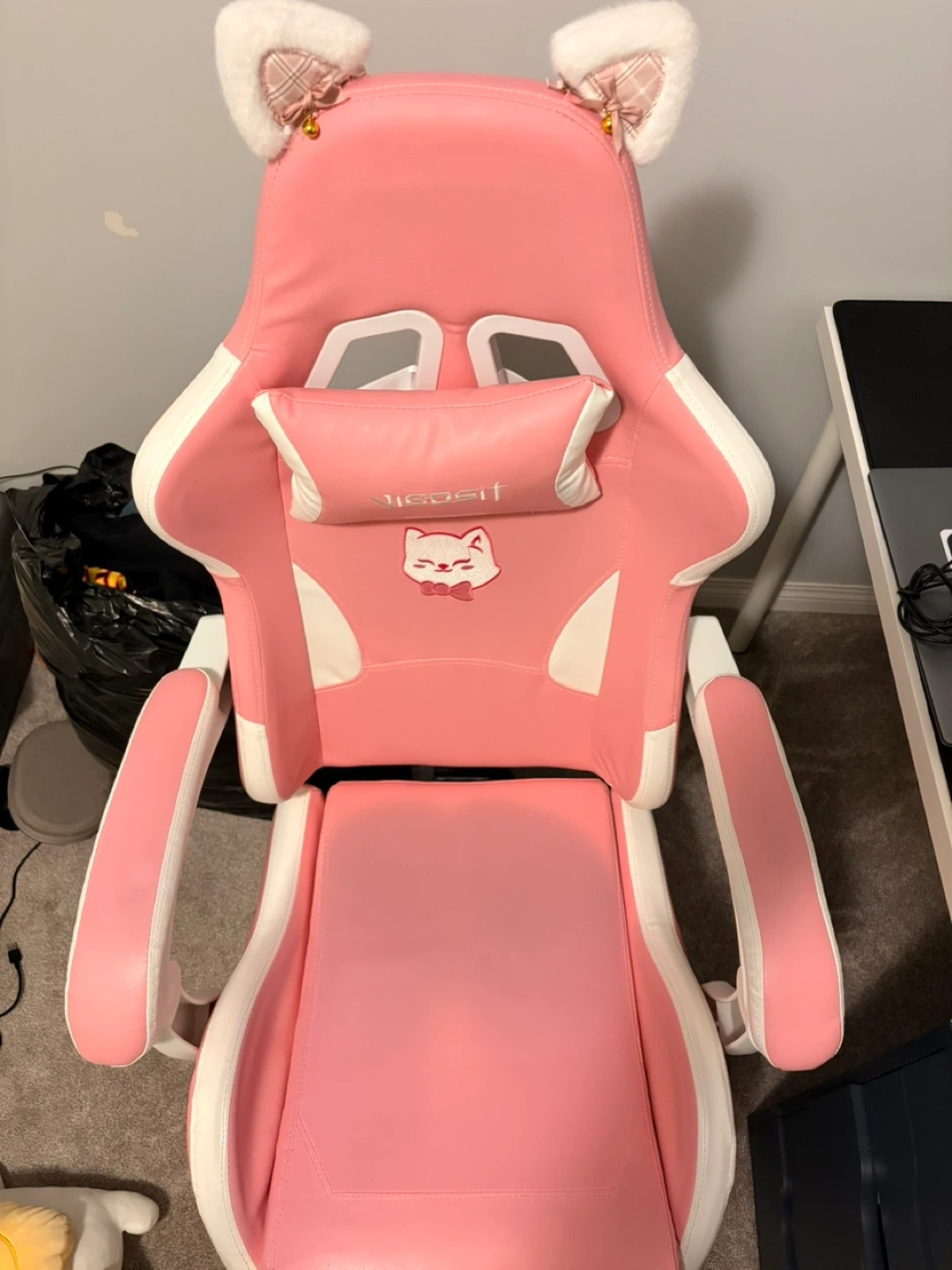 Cute pink gaming chair with white accents and fluffy cat ears on top. Includes a matching lumbar pillow shaped like a cat paw. This chair's design makes it a fun addition to any gaming setup!