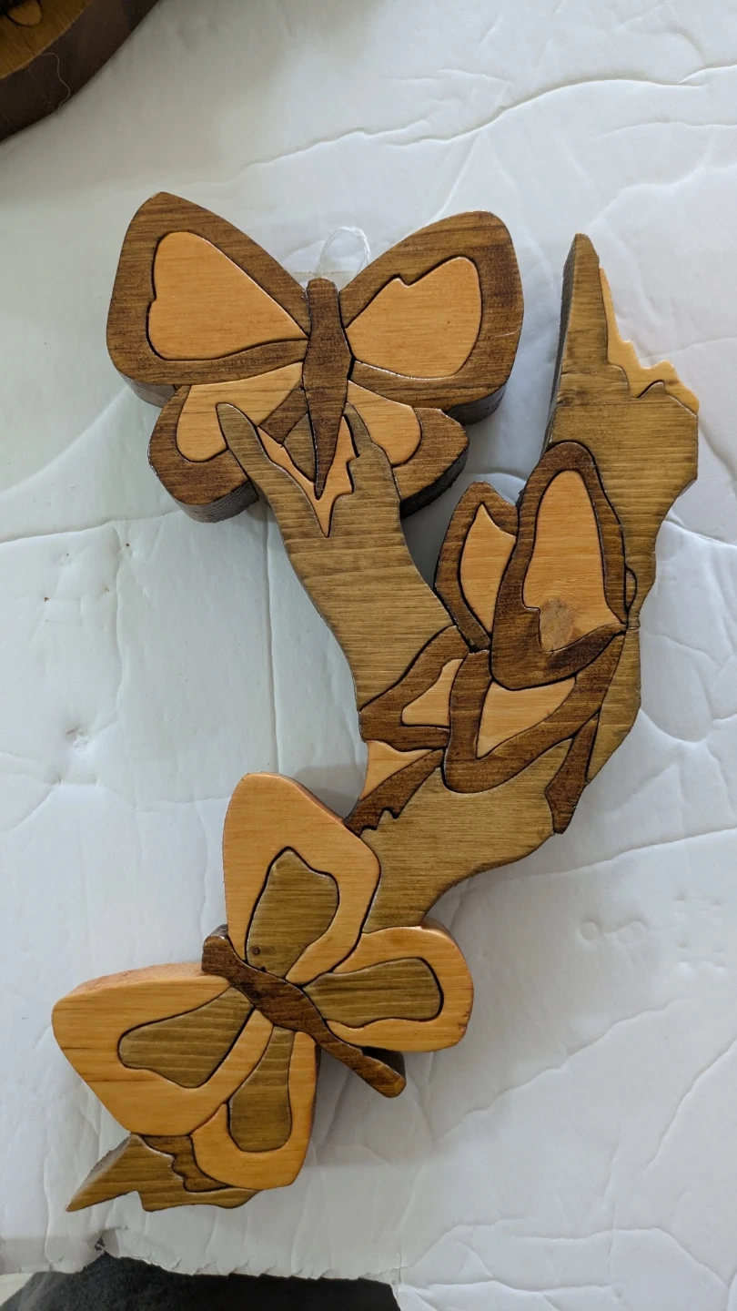 This is a decorative intarsia featuring butterflies. It's made of wood with contrasting wood tones. It would look nice on your wall! Semi gloss finish, hardboard backer. 5 3/4" W x 7/8" D x 9 1/2" H. New conditoon