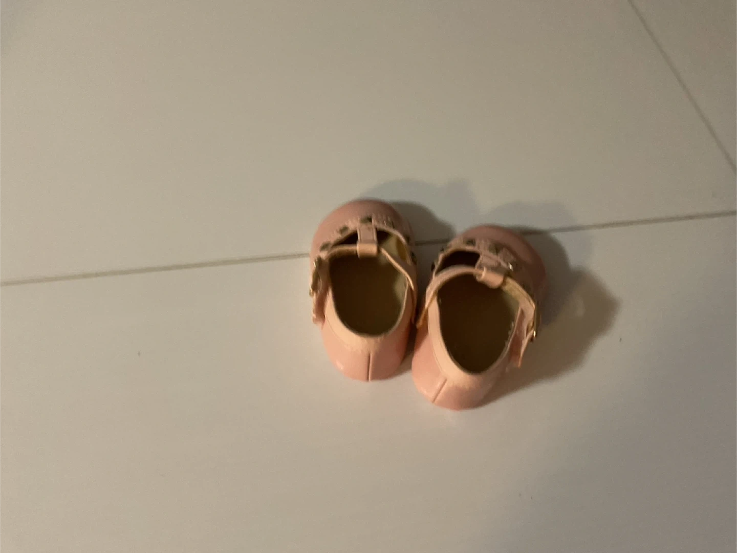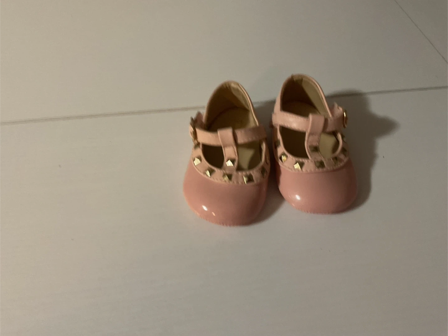 Cute pink Mary Jane style shoes for babies. They feature a T-strap closure with a buckle and decorative gold-tone studs on the toe. Shiny patent finish.