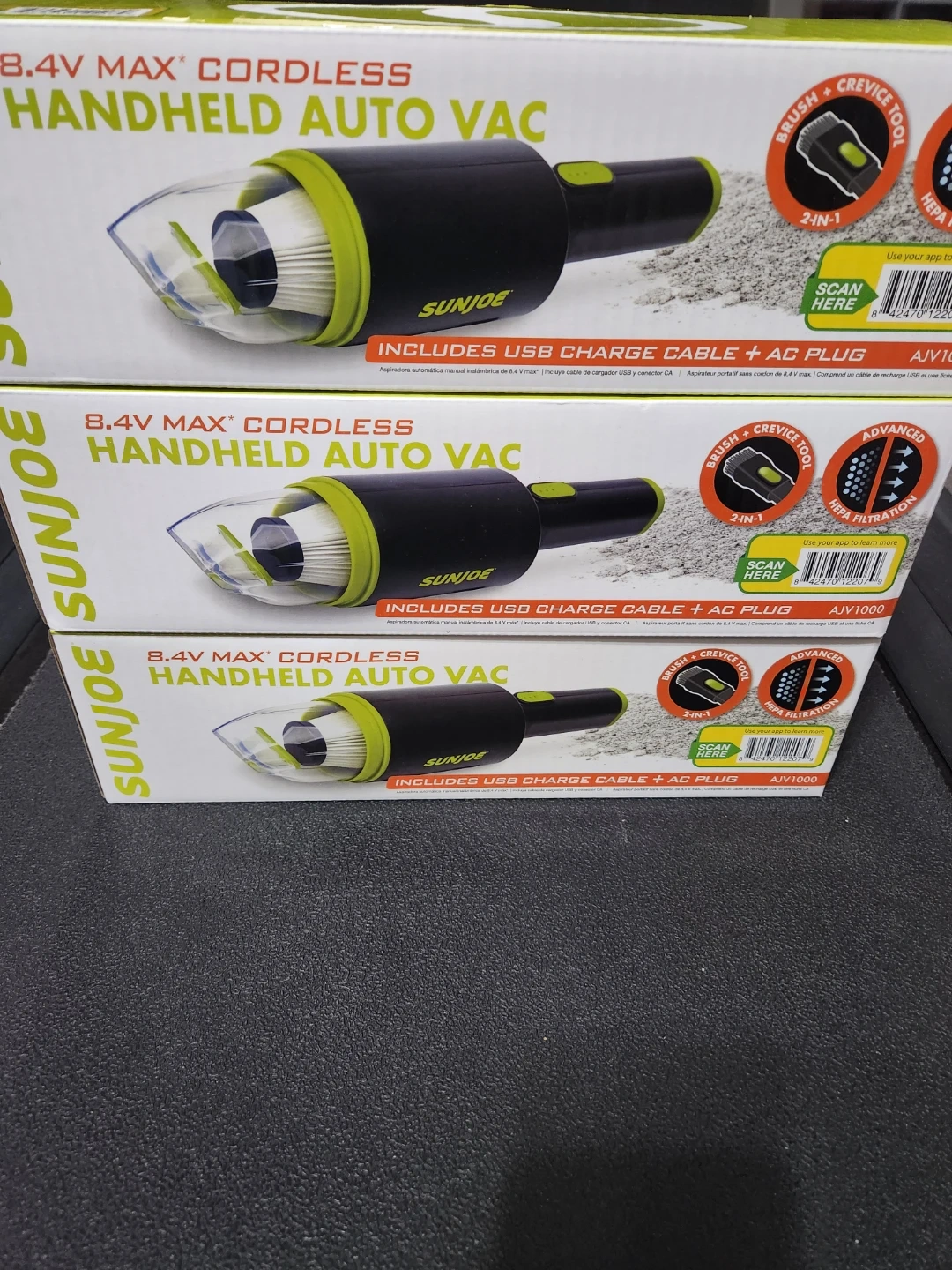 I'm selling a brand new Sun Joe 8.4V MAX Cordless Handheld Auto Vac, model AJV1000! This handy little vacuum is perfect for quick clean-ups in your car or around the house. It features a washable HEPA filter and comes with a USB charge cable and AC plug, so it's always ready to go. It also includes a brush and crevice tool attachment for those hard-to-reach spots. Includes the box!