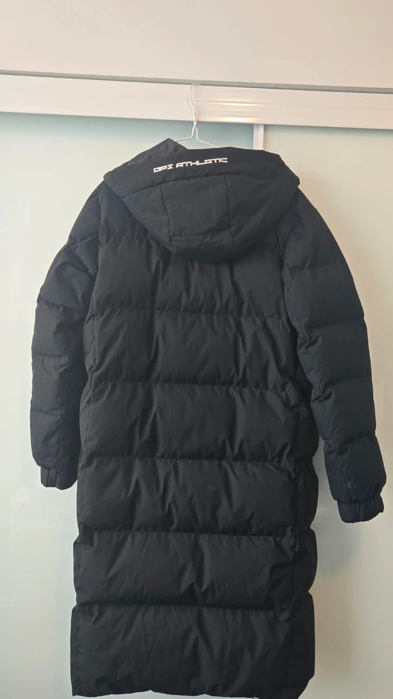 Beanpole Sport down puffer parka coat in black. It's a long puffer jacket with a hood. This coat is great for staying warm during colder months!