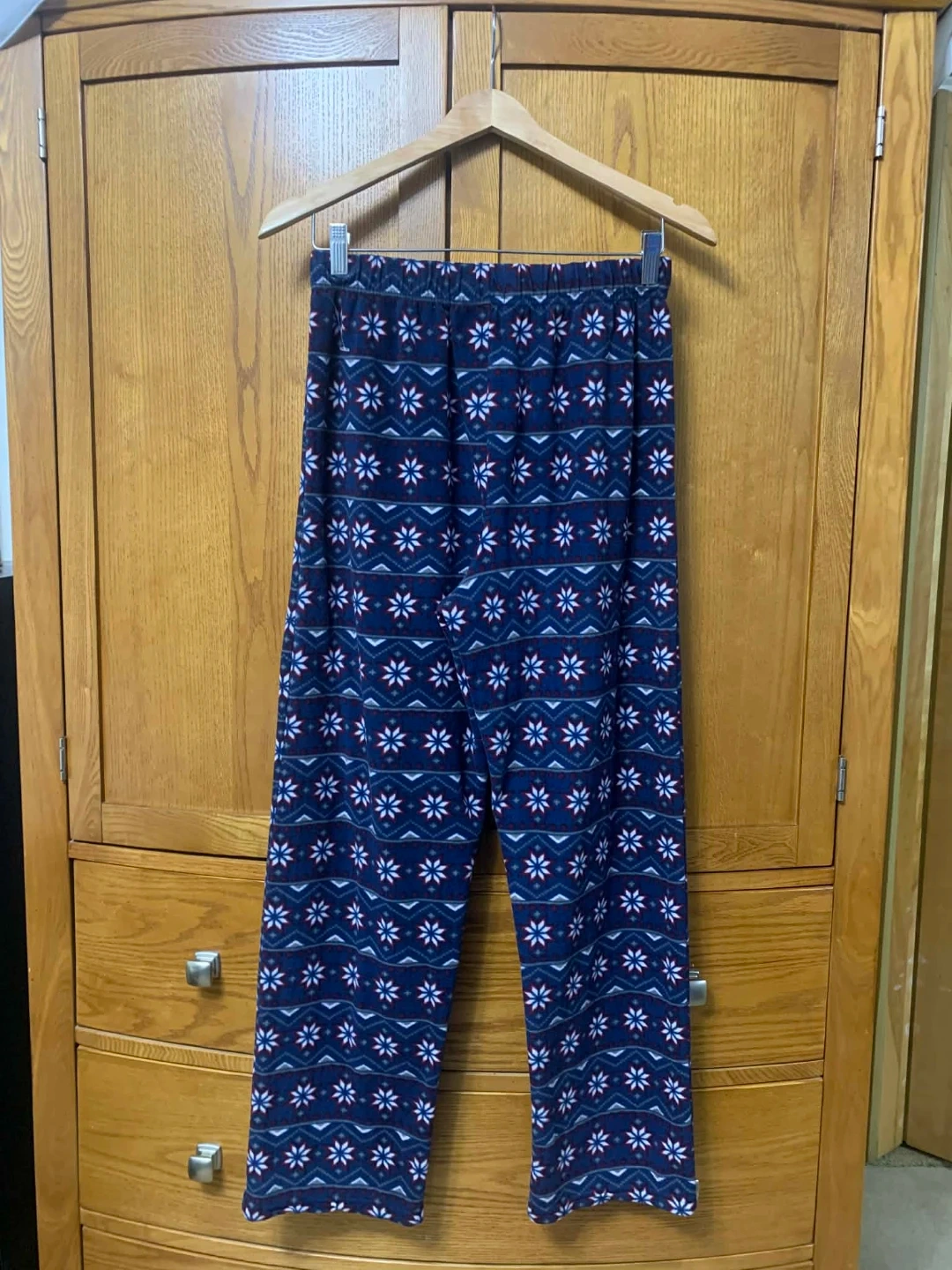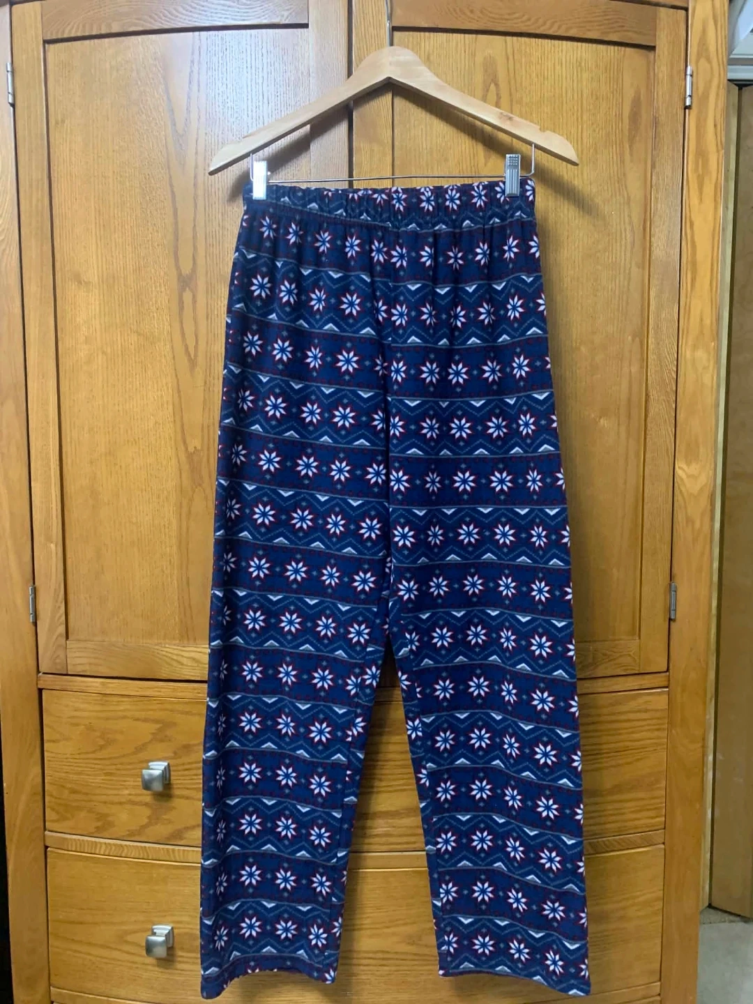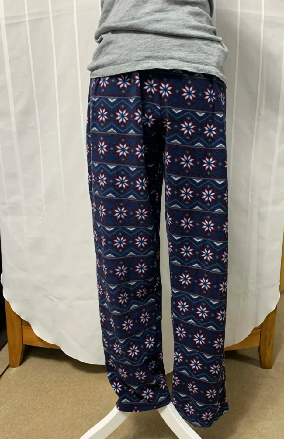 Cozy blue fleece pajama pants with a white and red snowflake pattern. Elastic waistband for comfort. Perfect for lounging or sleeping!