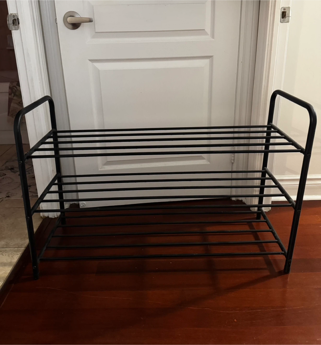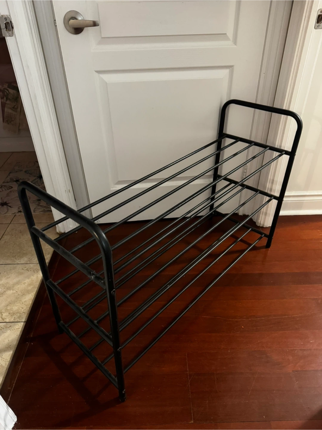 This is a black metal shoe rack with three tiers. It's made of metal and has a simple, sturdy design. Great for organizing footwear by the door or in a closet!