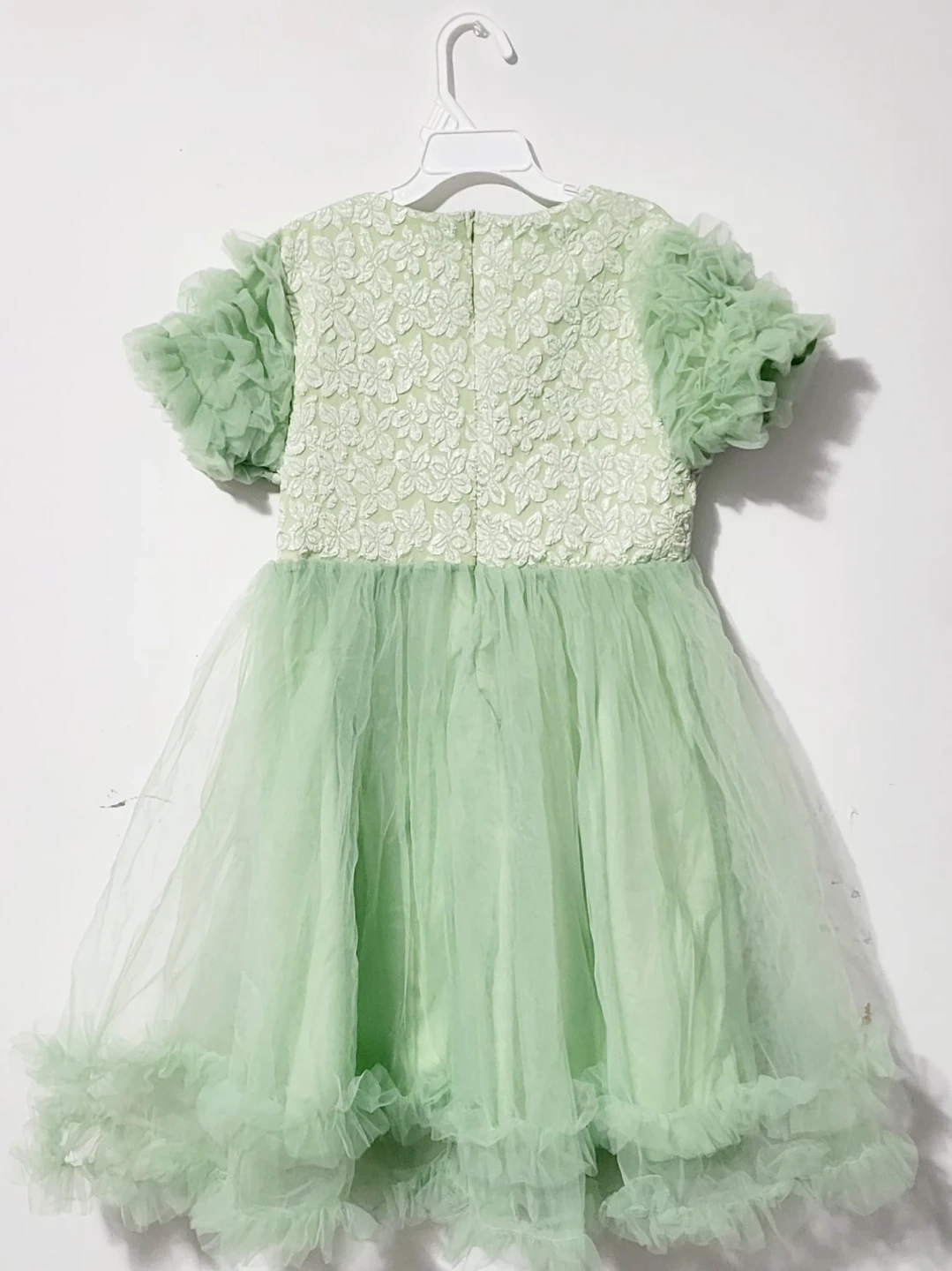 This sweet green dress features a delicate lace bodice and a fluffy tulle skirt with ruffled trim. It's perfect for special occasions or parties. The dress has short, puffy sleeves and a floral accent at the waist.