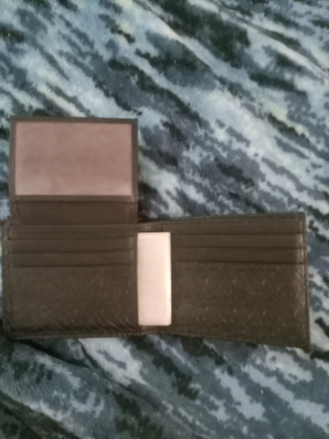 This is a black Guess bifold wallet. It features a textured exterior with a debossed Guess logo pattern. Multiple card slots and a clear ID window are inside. It's a stylish and functional accessory for everyday use.