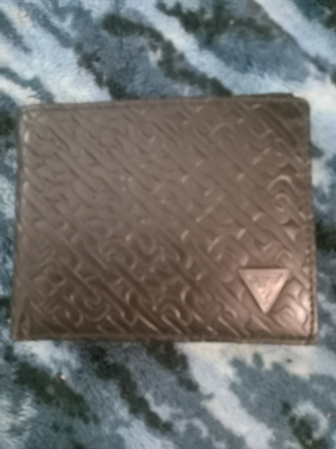This is a black Guess bifold wallet. It features a textured exterior with a debossed Guess logo pattern. Multiple card slots and a clear ID window are inside. It's a stylish and functional accessory for everyday use.