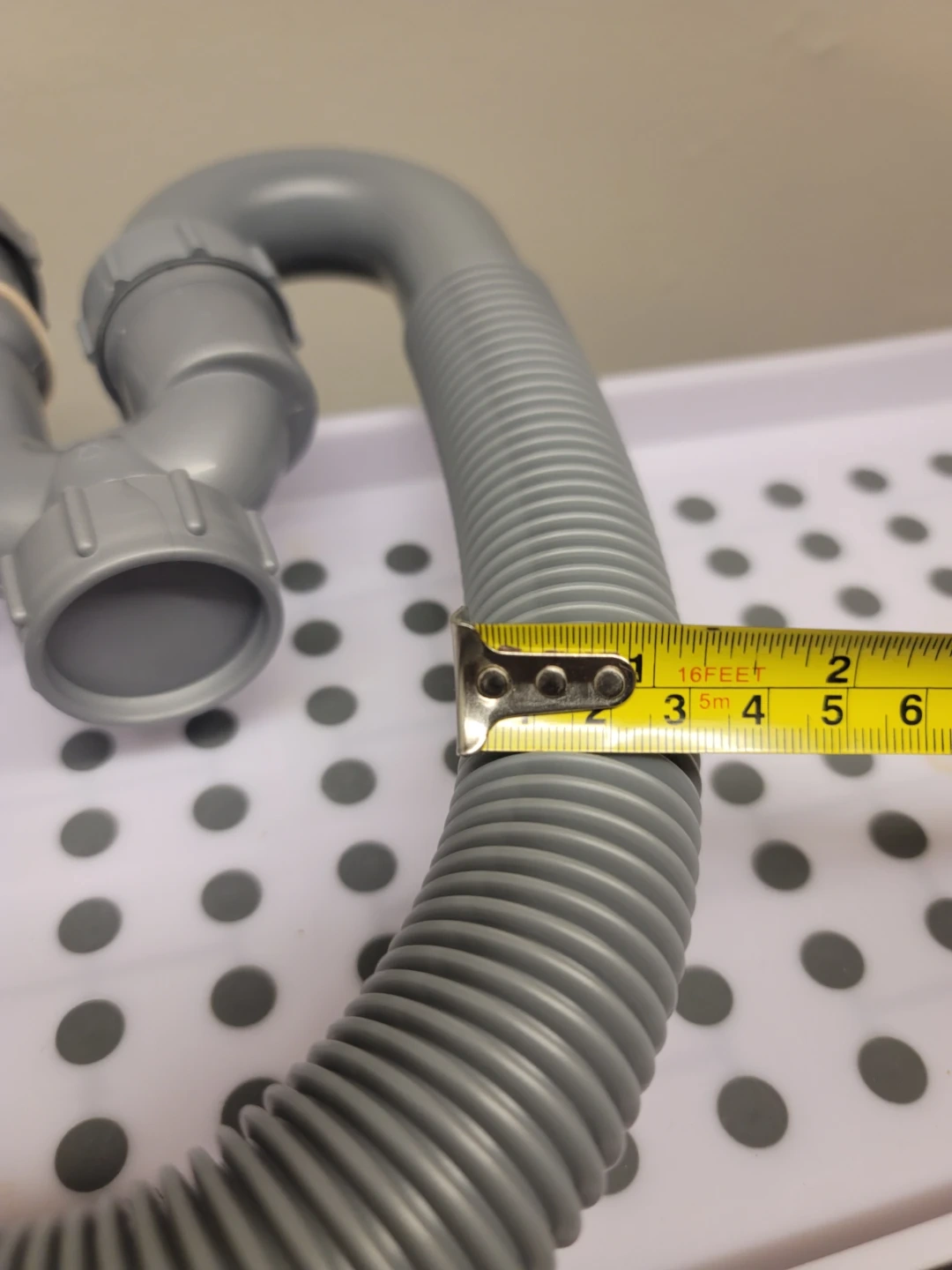 Grey flexible drain pipe with a built-in P-trap. It's made of durable plastic and has threaded connections. This pipe is useful for installations to prevent odours from entering the space.