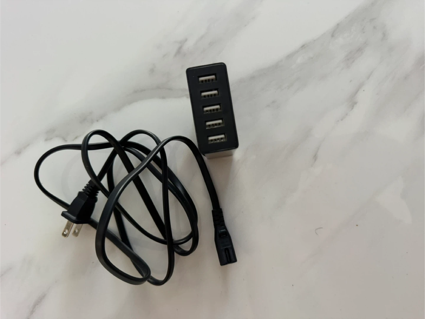 This is a 5-port USB charging hub. It comes with a power cord for easy setup. It's black and made of plastic.