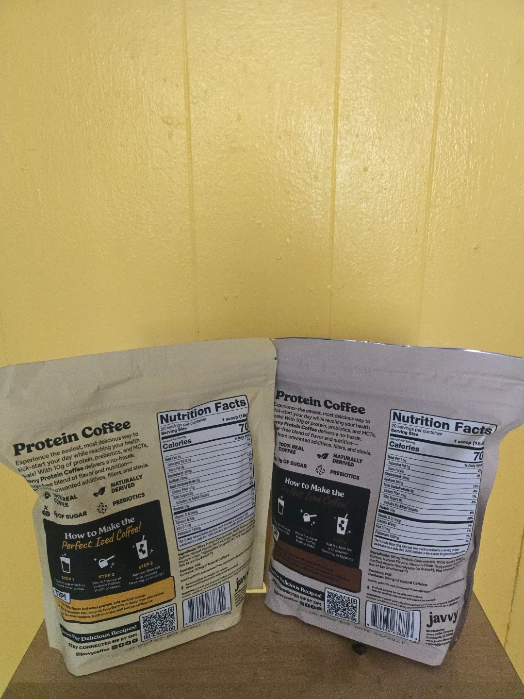 Enjoy Javy's protein coffee, made with naturally derived ingredients and prebiotics. Each serving contains 10g of protein and 0g of sugar. It's perfect for a quick and healthy pick-me-up!