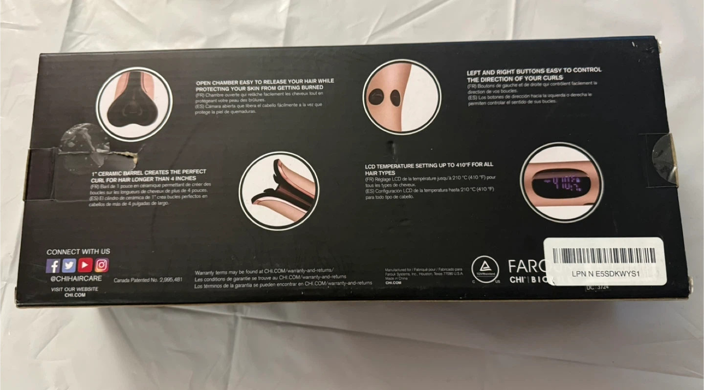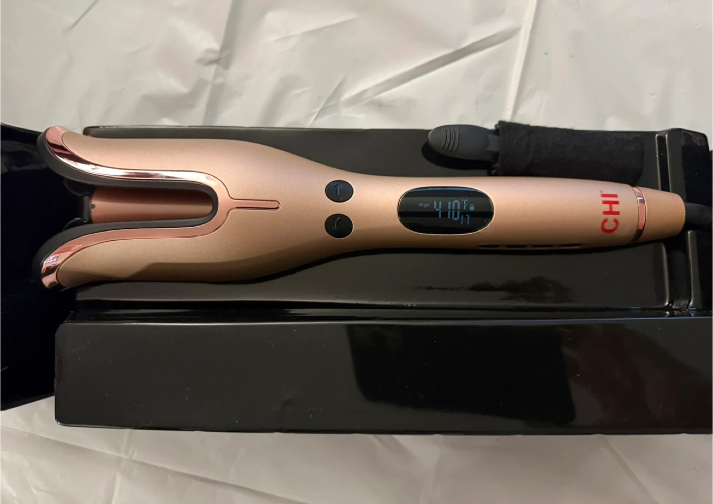 This is the CHI Spin N Curl Special Edition Rose Gold Hair Curler with a 1-inch ceramic barrel. It heats up to 410°F for all hair types and offers left and right button controls for curl direction. Comes with a free cleaning tool.