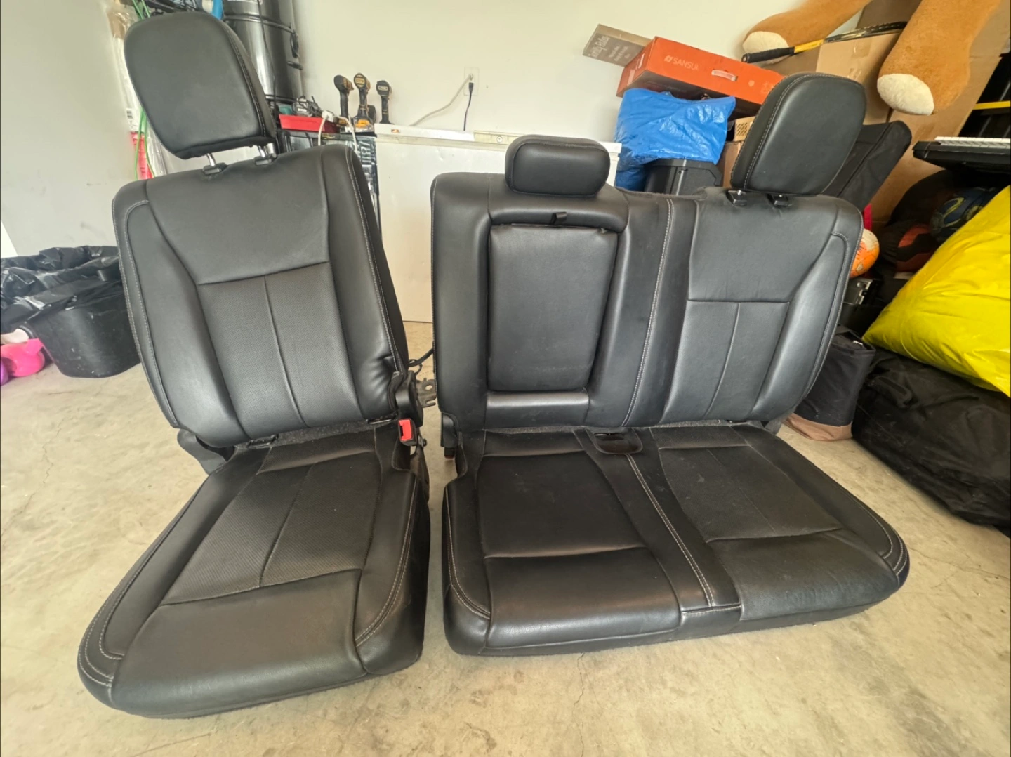 Selling a set of used black leather car seats. From Ford F150, 2019 lariat They show some signs of wear, as seen in the photos, but are still in usable condition. Perfect for a replacement or restoration project!