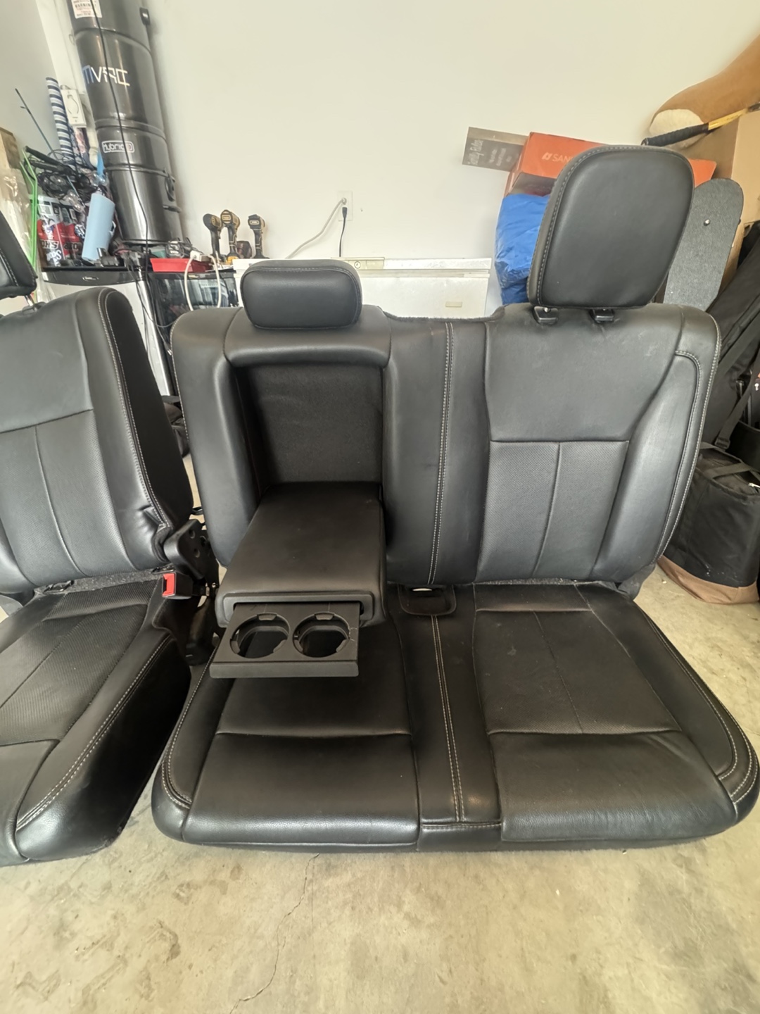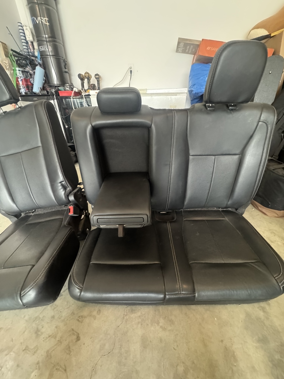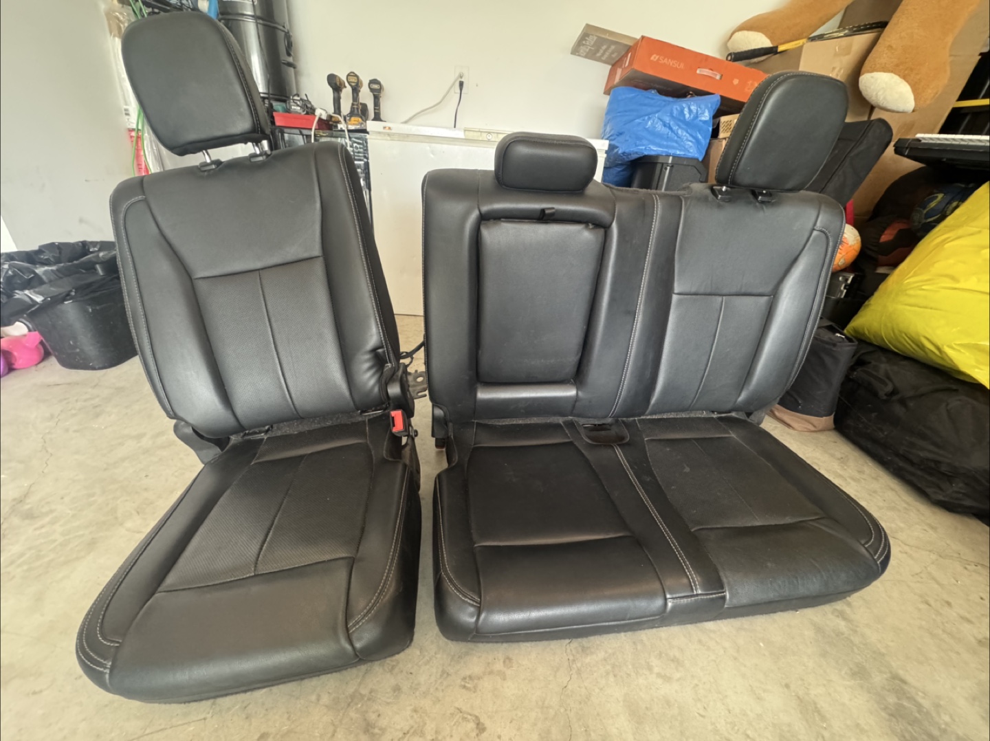 Selling a set of used black leather car seats. From Ford F150, 2019 lariat They show some signs of wear, as seen in the photos, but are still in usable condition. Perfect for a replacement or restoration project!