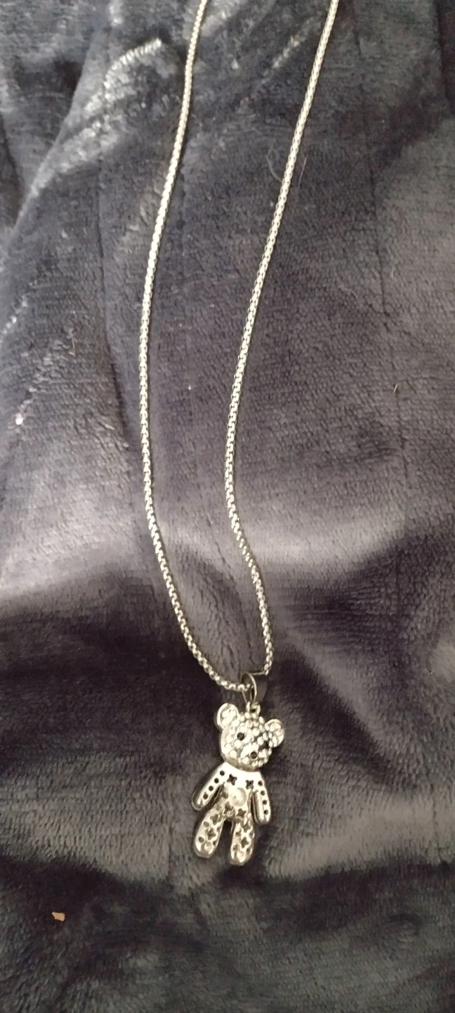Cute silver necklace with a teddy bear pendant. The teddy bear is adorned with small rhinestones, adding a touch of sparkle. Perfect for adding a bit of fun to any outfit!
