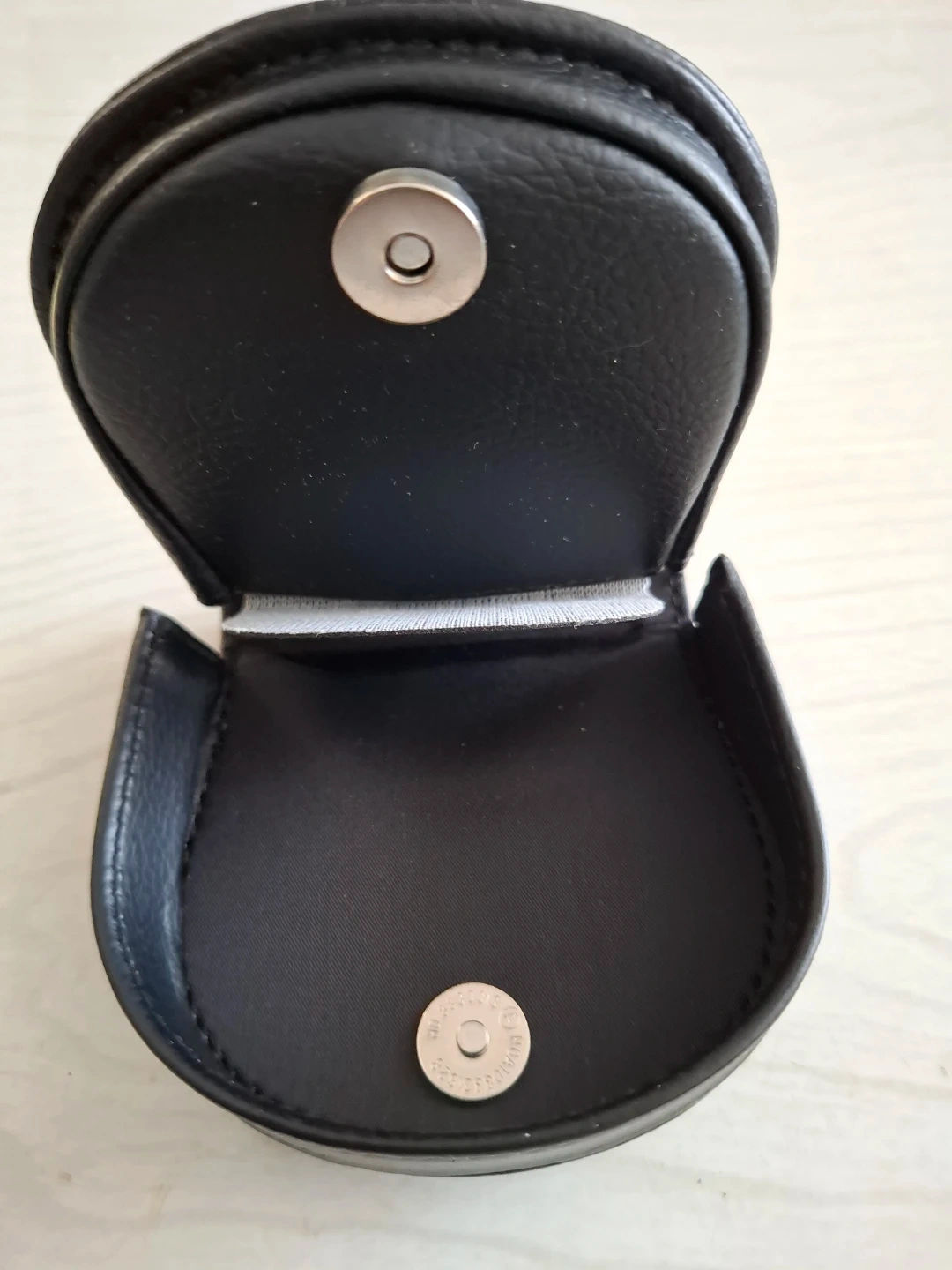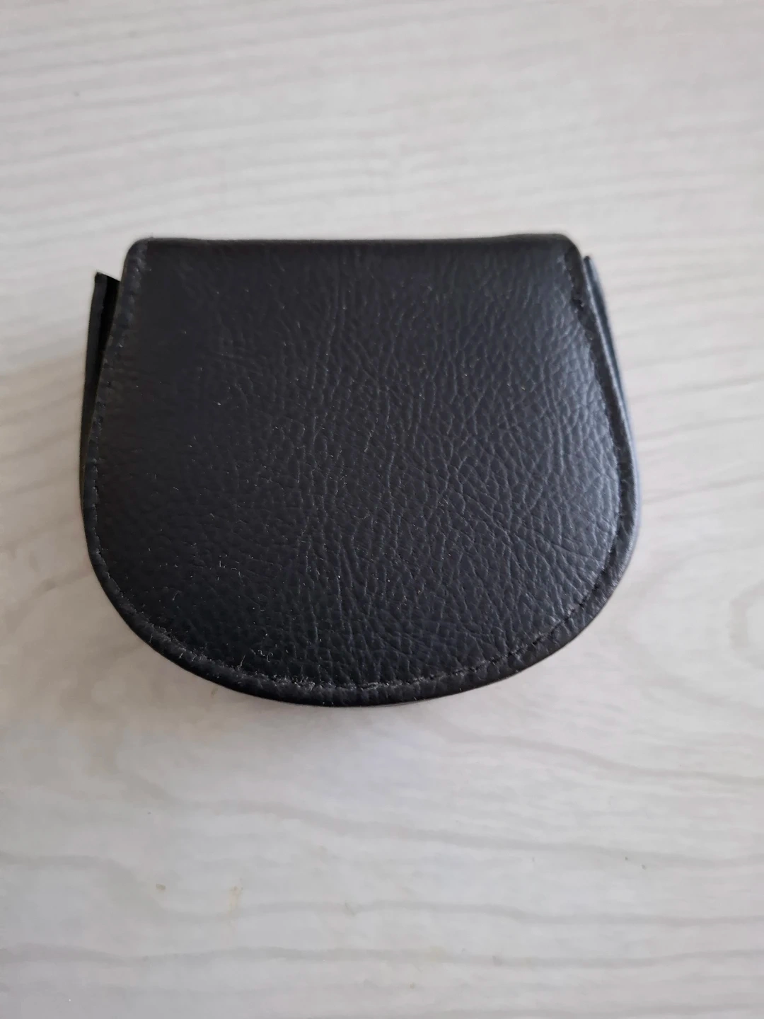 A black coin pouch made of leather. It has a snap closure for security. This pouch is great for keeping your loose change organized.