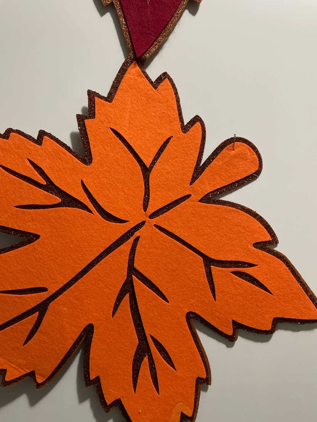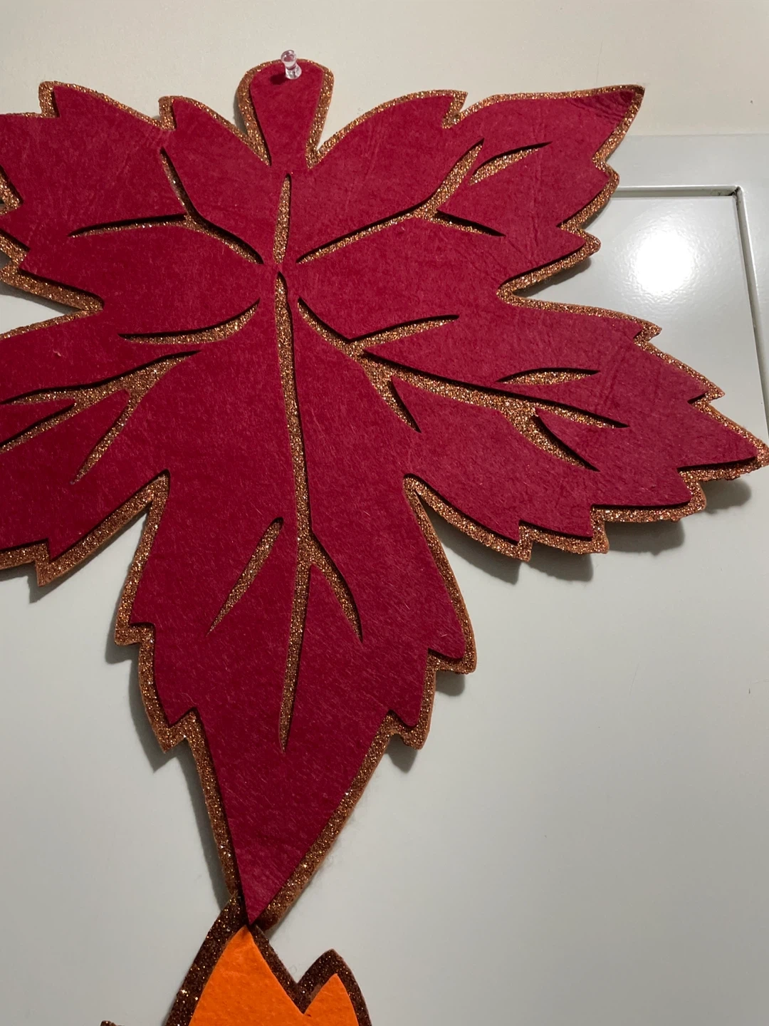 Autumn themed felt leaf garland. Features three maple leaves in red, orange, and green. Each leaf has glitter-trimmed edges. Great for seasonal decor!