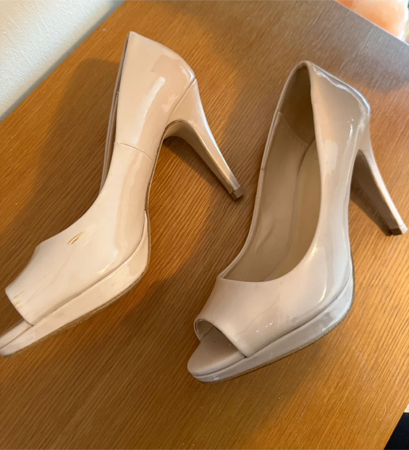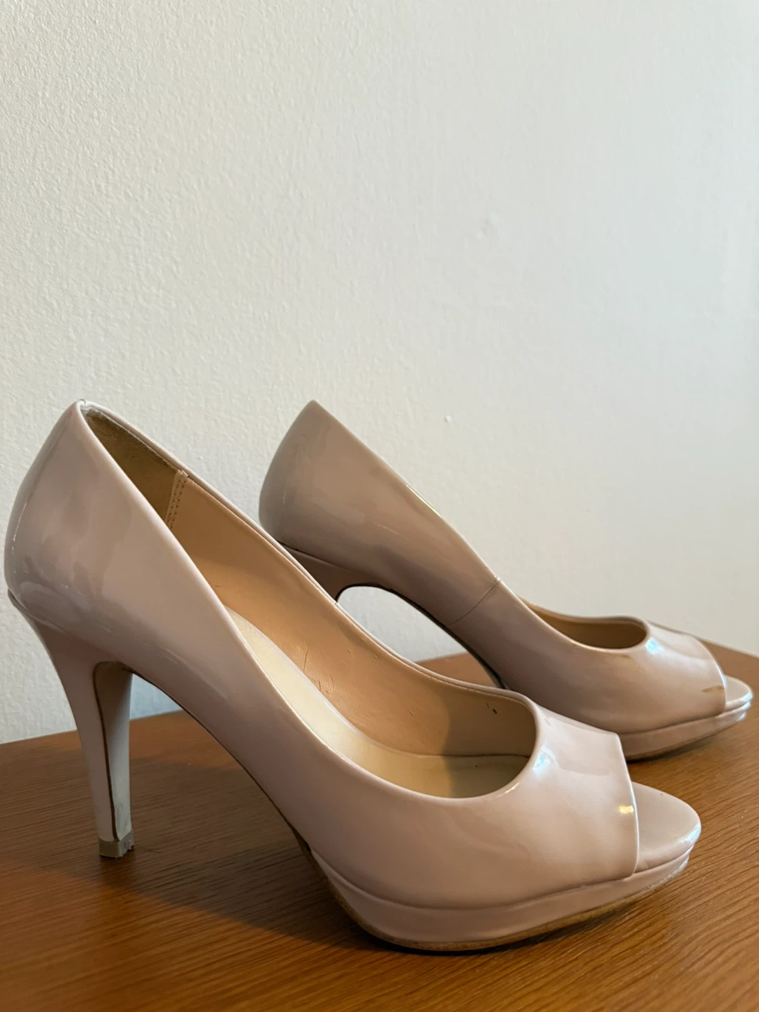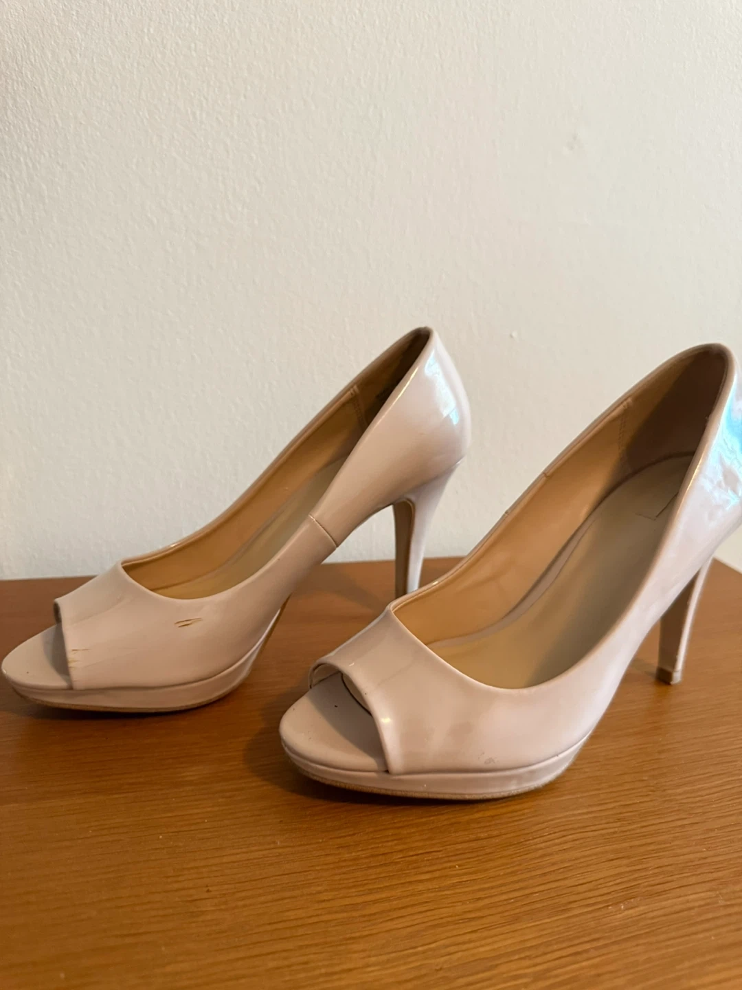 These Aldo heels are a classic peep toe style in a beige patent leather finish. They're perfect for dressing up any outfit! There are some signs of wear, as shown in the pictures.