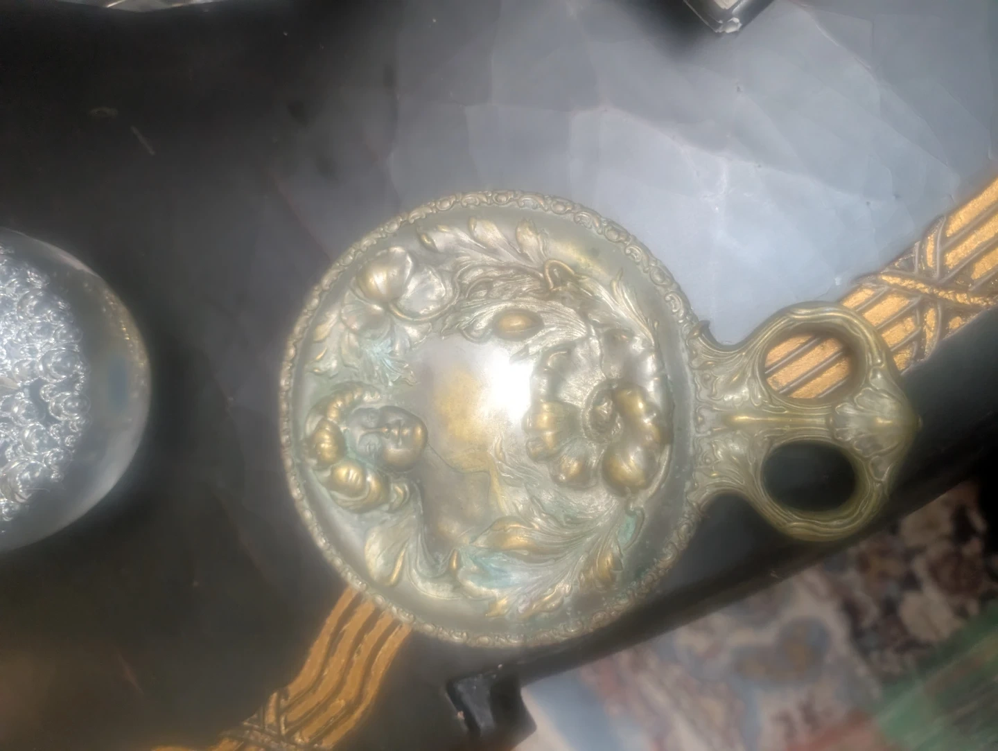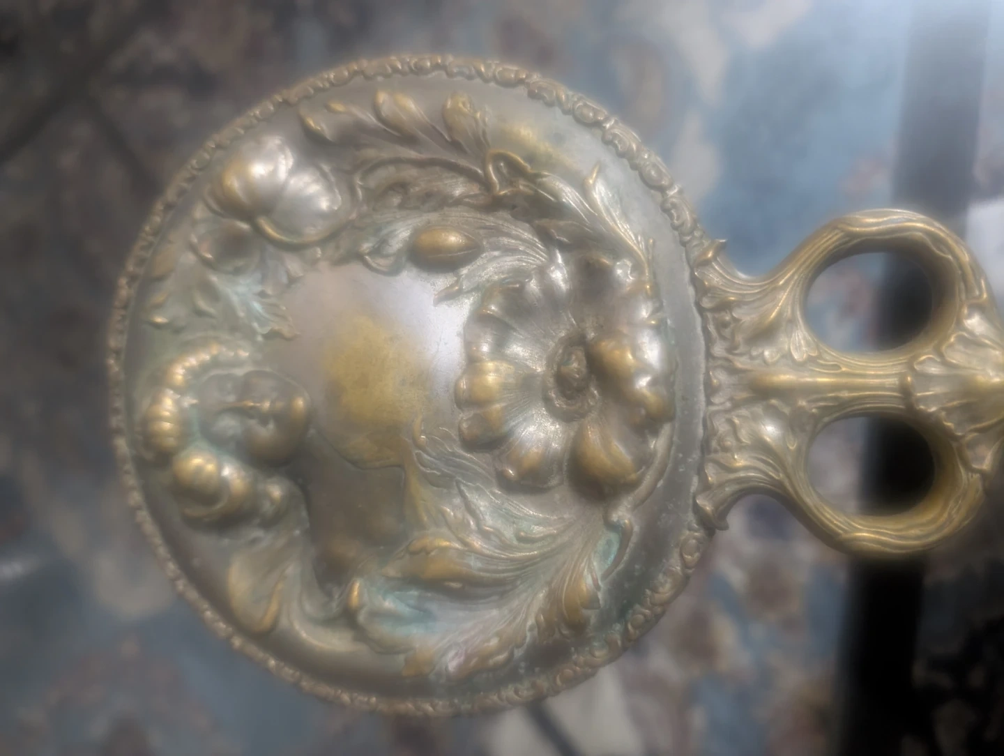 This is a beautiful antique handheld mirror. It features an ornate design with a floral and portrait motif. The handle has a decorative looped design. It's a lovely piece for display or use!
