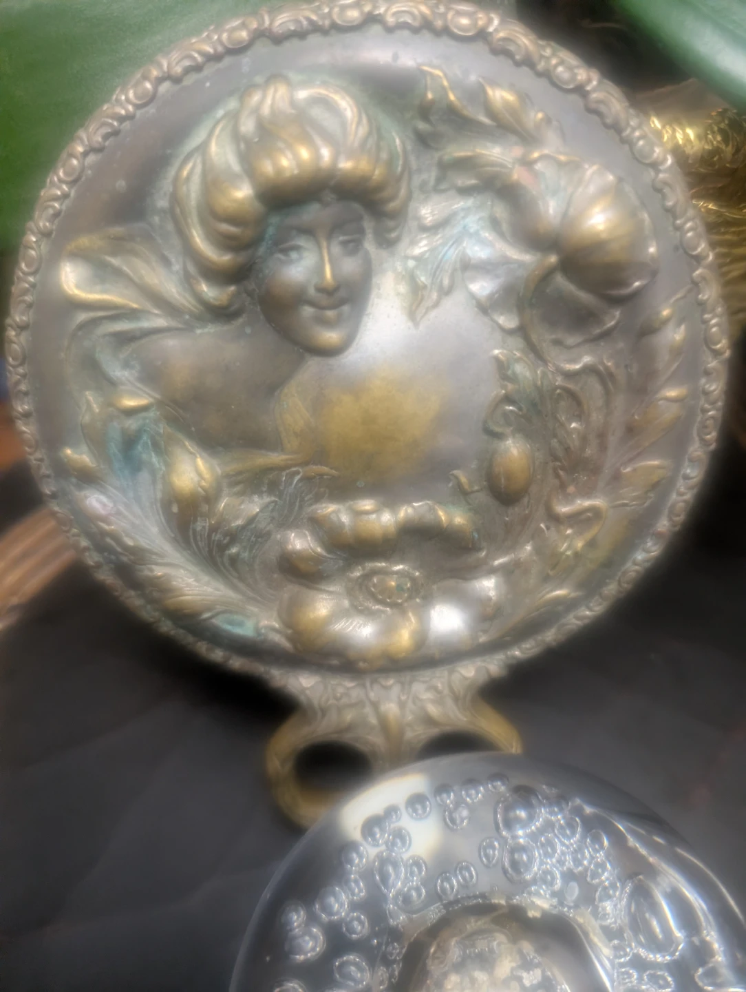 This is a beautiful antique handheld mirror. It features an ornate design with a floral and portrait motif. The handle has a decorative looped design. It's a lovely piece for display or use!