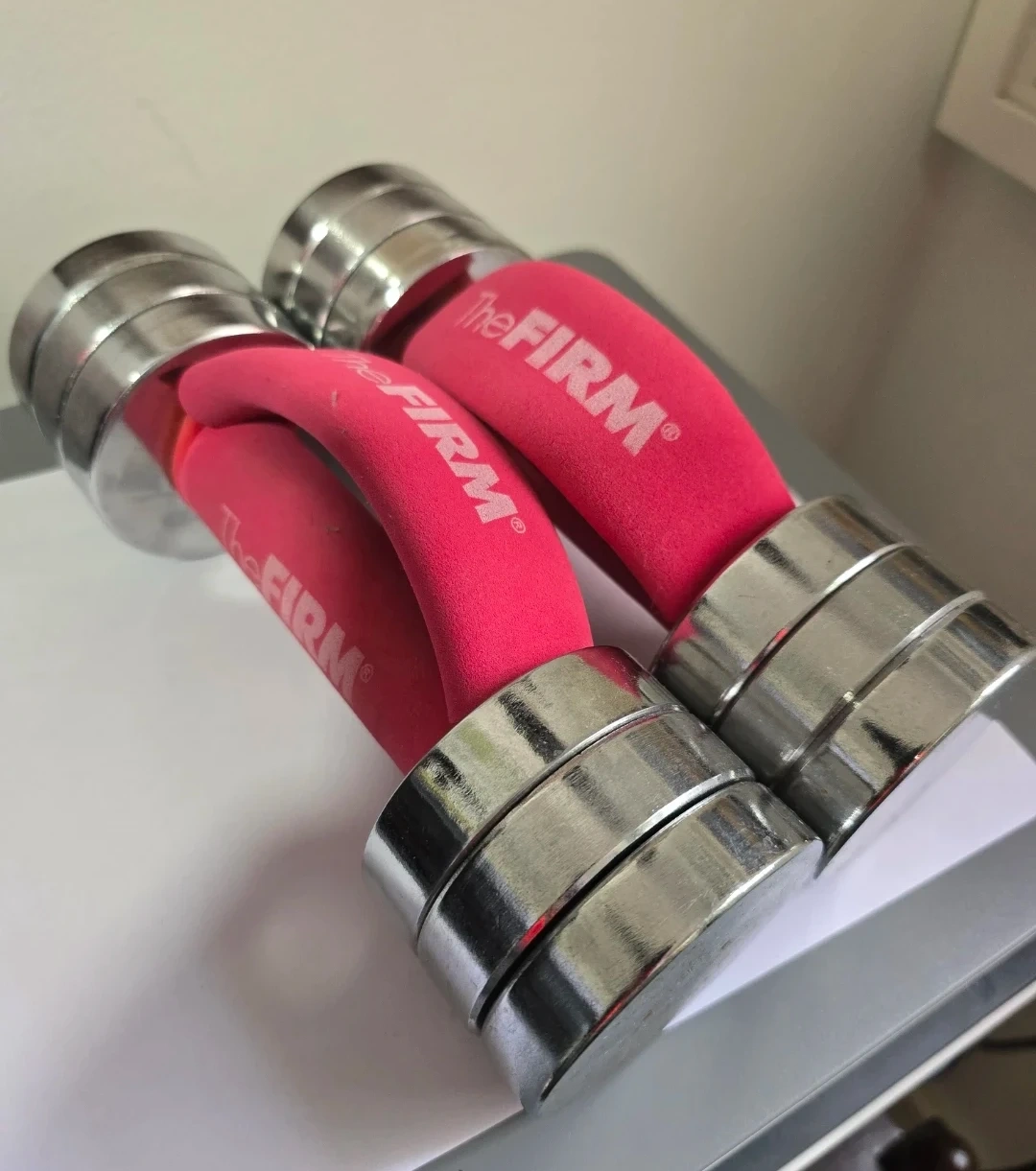 Pink handled dumbbells by The FIRM. Features chrome-plated weights and comfortable foam grips. These are sold as a pair.4.2kgx2 and you can add weighs or reduce.