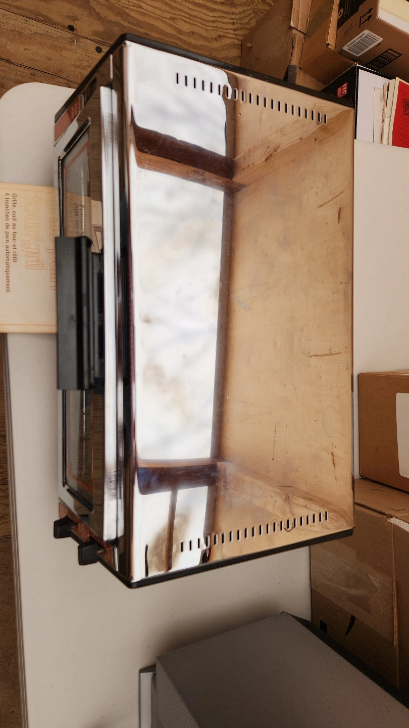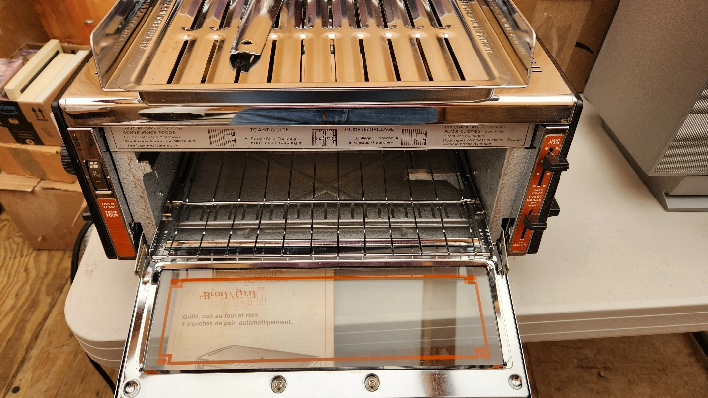 Chrome finish. Four-slice capacity. Broils, bakes, and toasts. Includes instruction manual. Excellent condition. No sign of it being used. This toaster oven is heavy duty. They do not build them this way any longer!