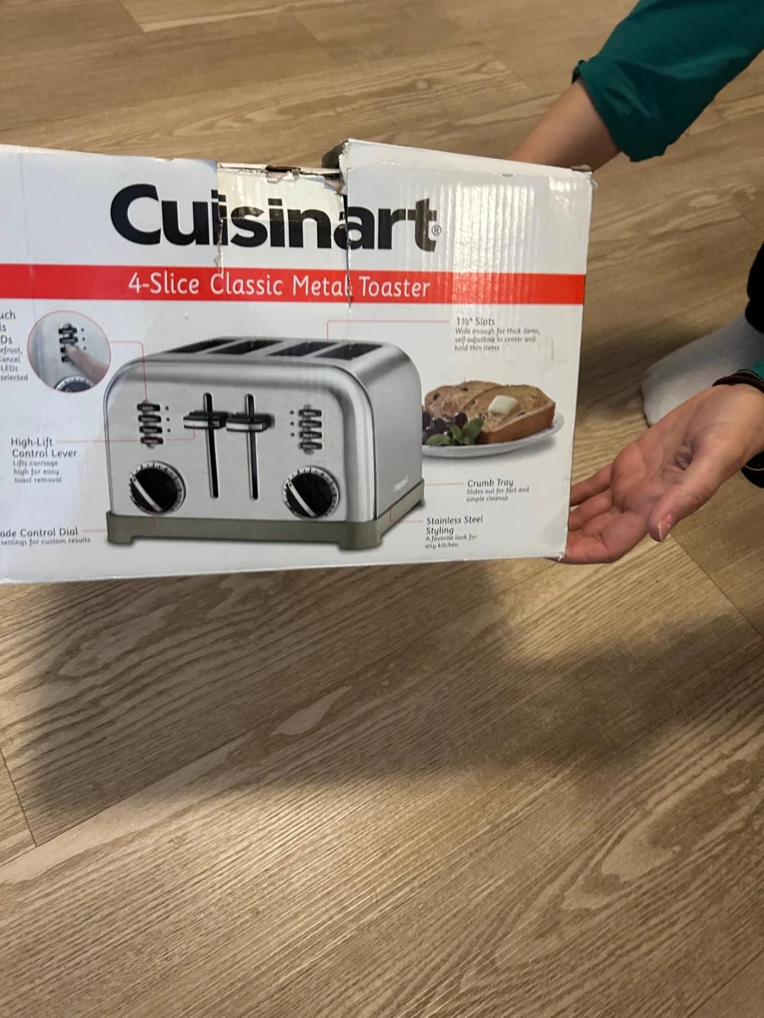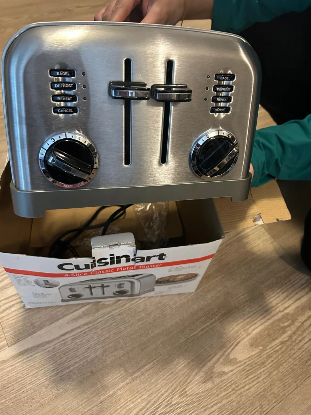 Cuisinart 4-Slice Classic Metal Toaster. Stainless steel construction. Features include Bagel, Defrost, Reheat, and Cancel settings. Browning control dial with multiple settings.