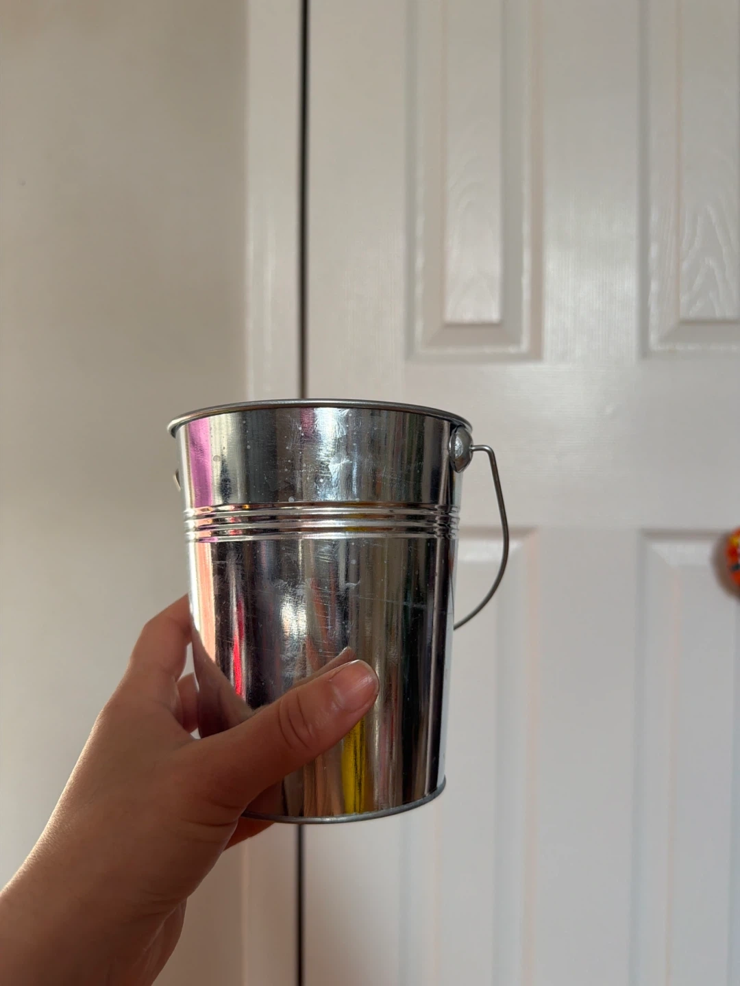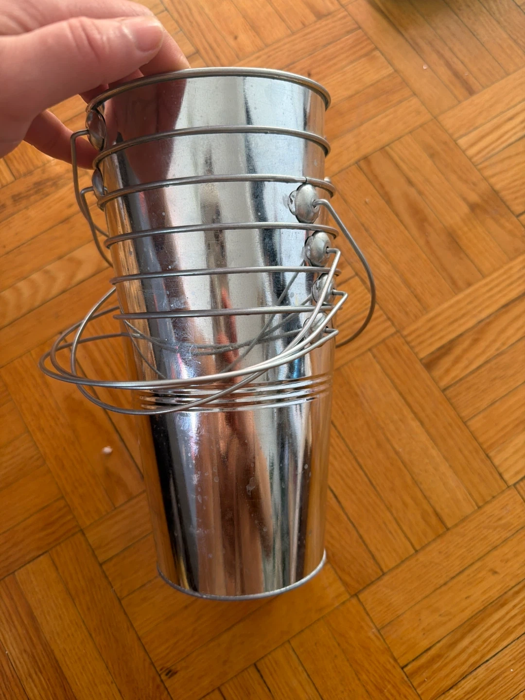 These are 6 small decorative pails made of shiny metal. They each have a wire handle for carrying or hanging. They're useful for small planters or party favours!