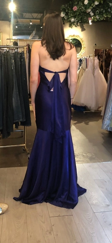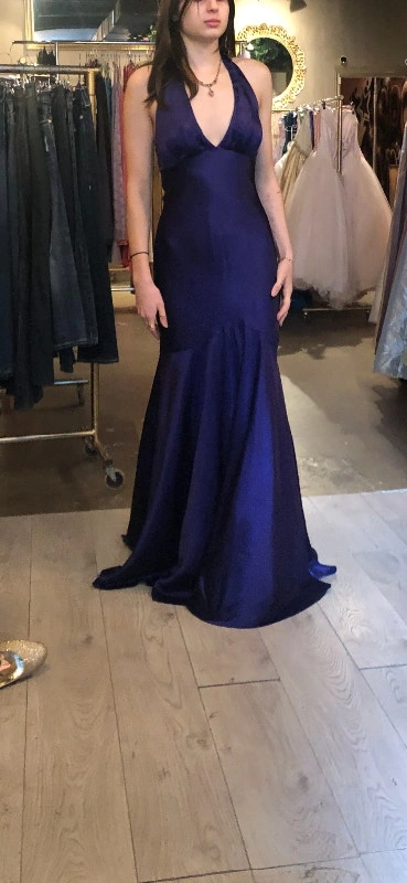 Gorgeous silk lined prom or evening dress in dark amethyst/royal blue. Fits sizes 4 to 8. Lined. Breast area is also lined, so no bra is needed. Very unique, designer, one of a kind. Tag still on. Open back.
