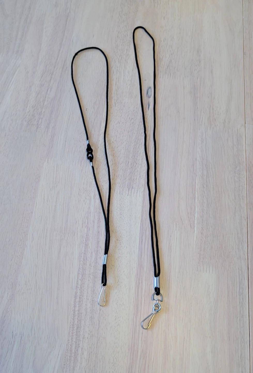 Two black lanyards included. One features a lobster clasp and the other a small hook clip. Both have adjustable toggles and metal crimps. These are great for carrying keys or ID badges.