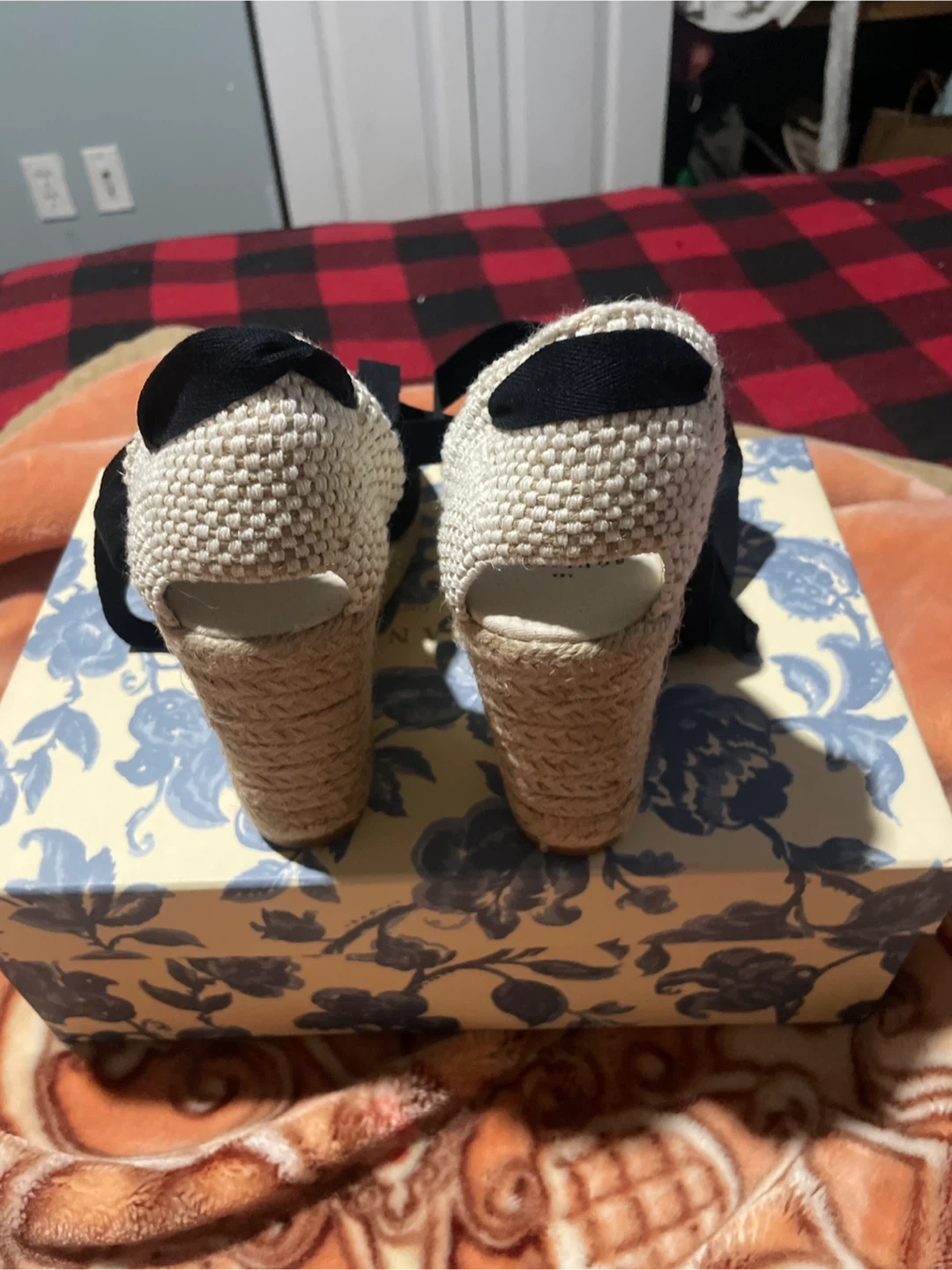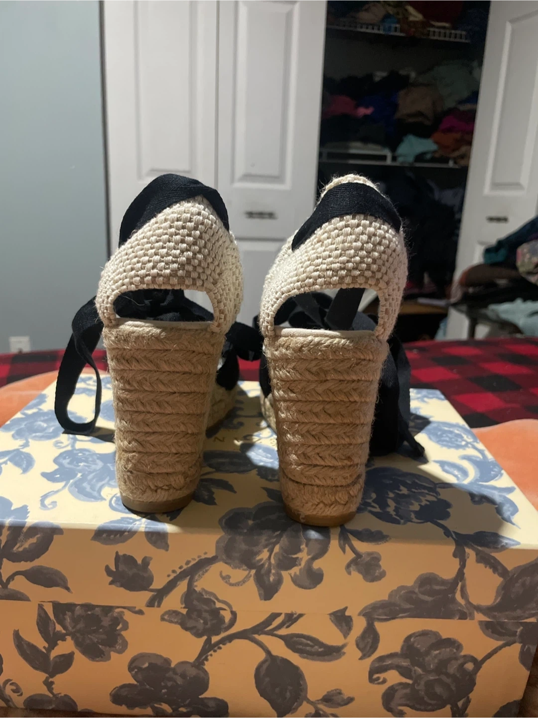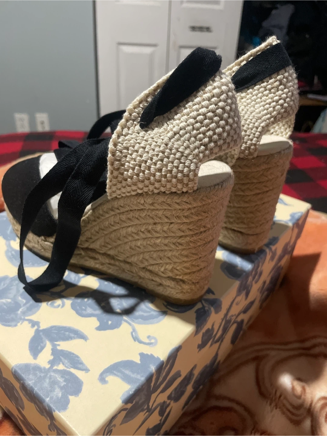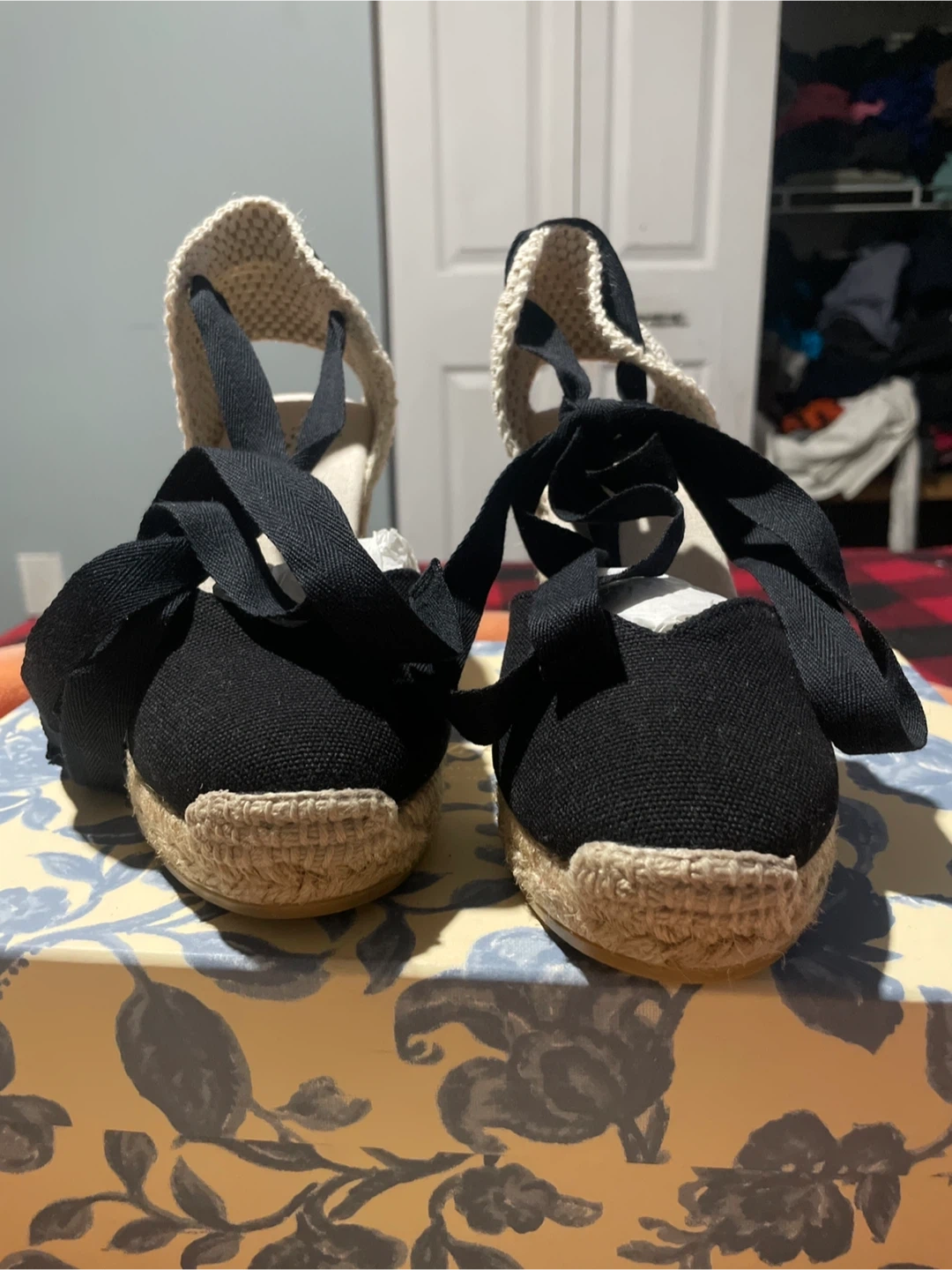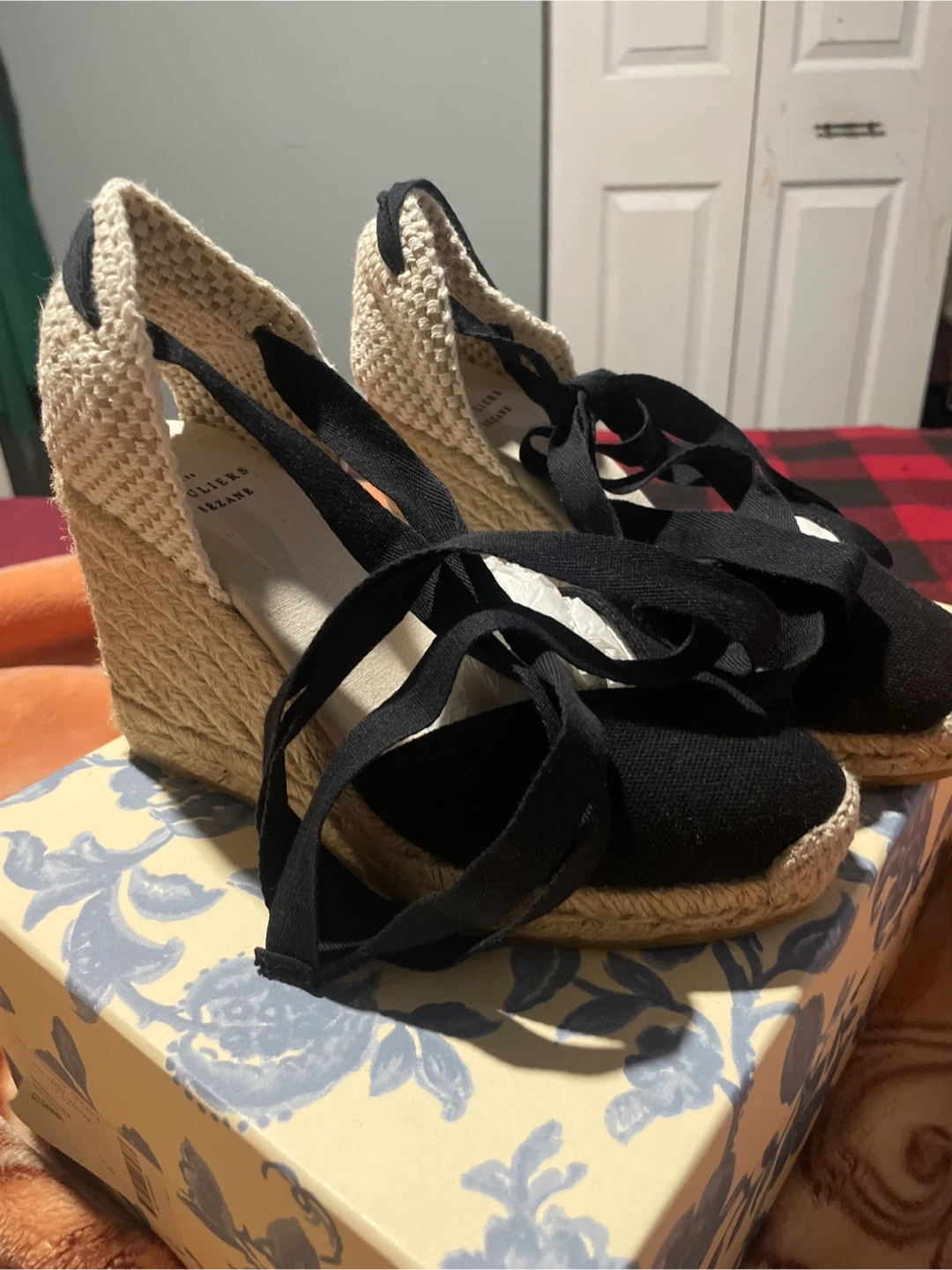 Black espadrille wedges by Les Souliers Sezane. Features black canvas uppers with tie-up ankle straps. Comes with original box and the original shoe bag inside. Size is 35.