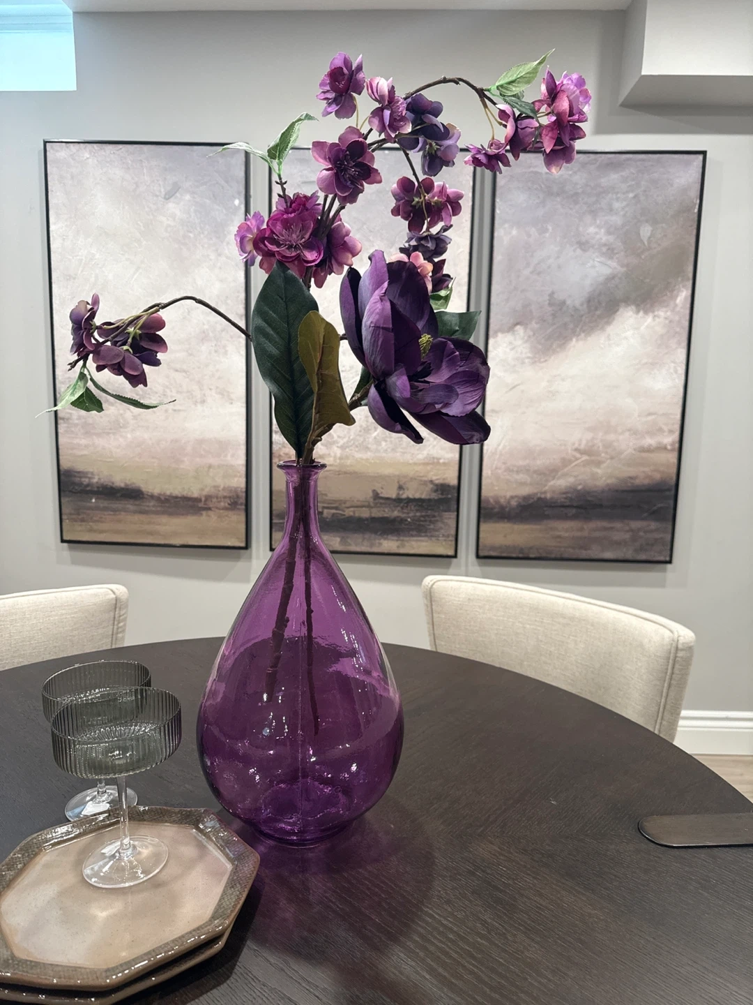 A beautiful deep purple glass vase with a unique teardrop shape. It's accented with a dramatic arrangement of artificial deep purple and pink flowers, including a large magnolia bloom. This piece adds a vibrant pop of colour and elegance to any room!