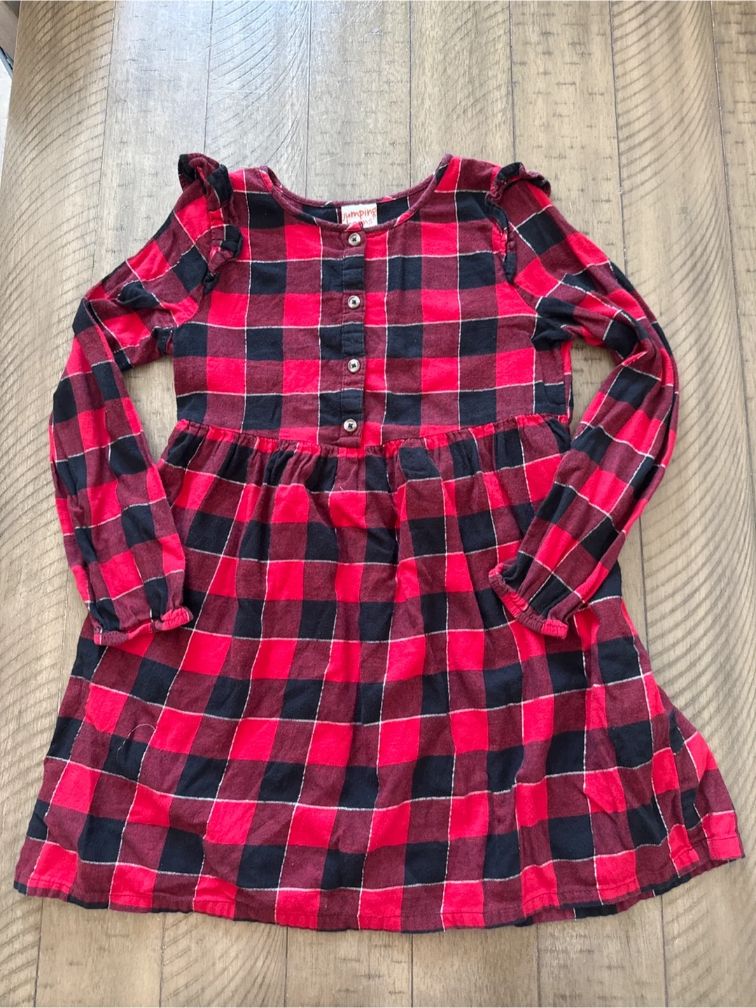 Girls' red and black buffalo plaid dress with button front and ruffled shoulders. Long sleeves with elastic cuffs. Flannel material.