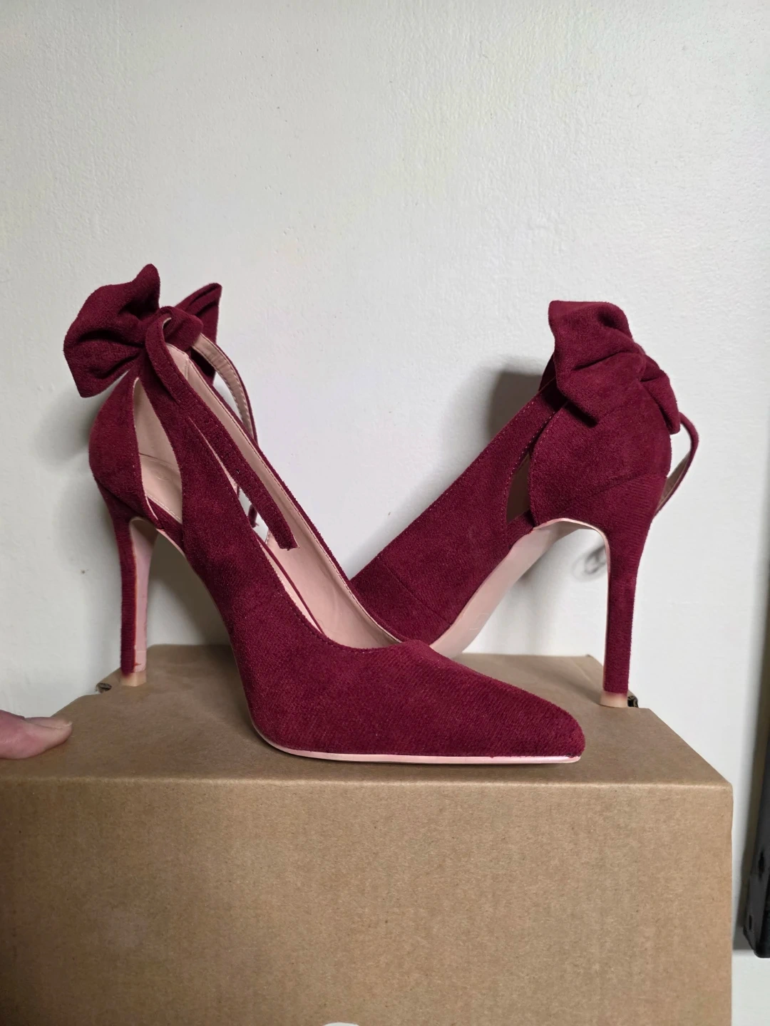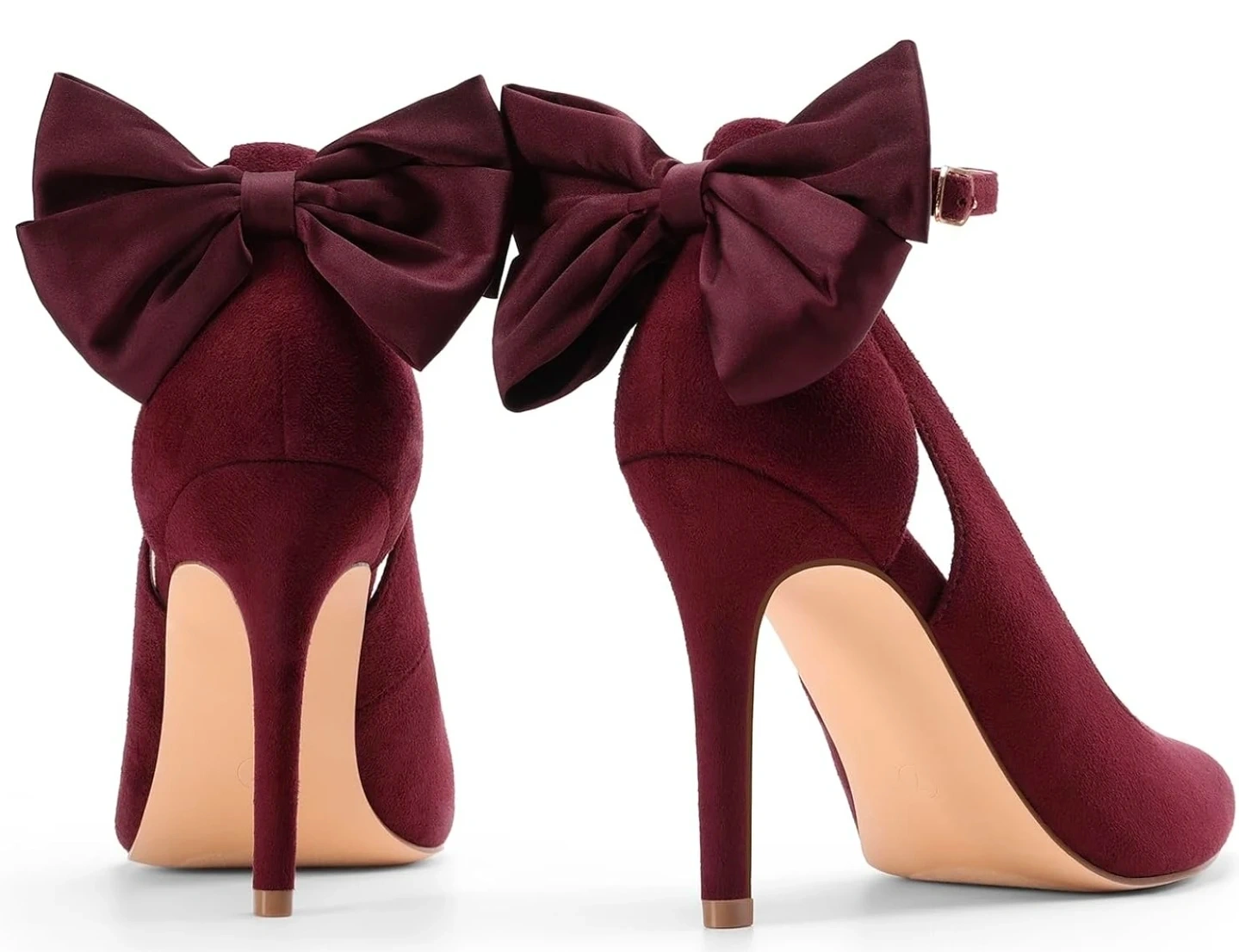 Stylish burgundy high heels with decorative bows at the back. Features delicate ankle straps for a secure fit. The pointed toe design offers a sophisticated look. Great for dressing up any outfit!