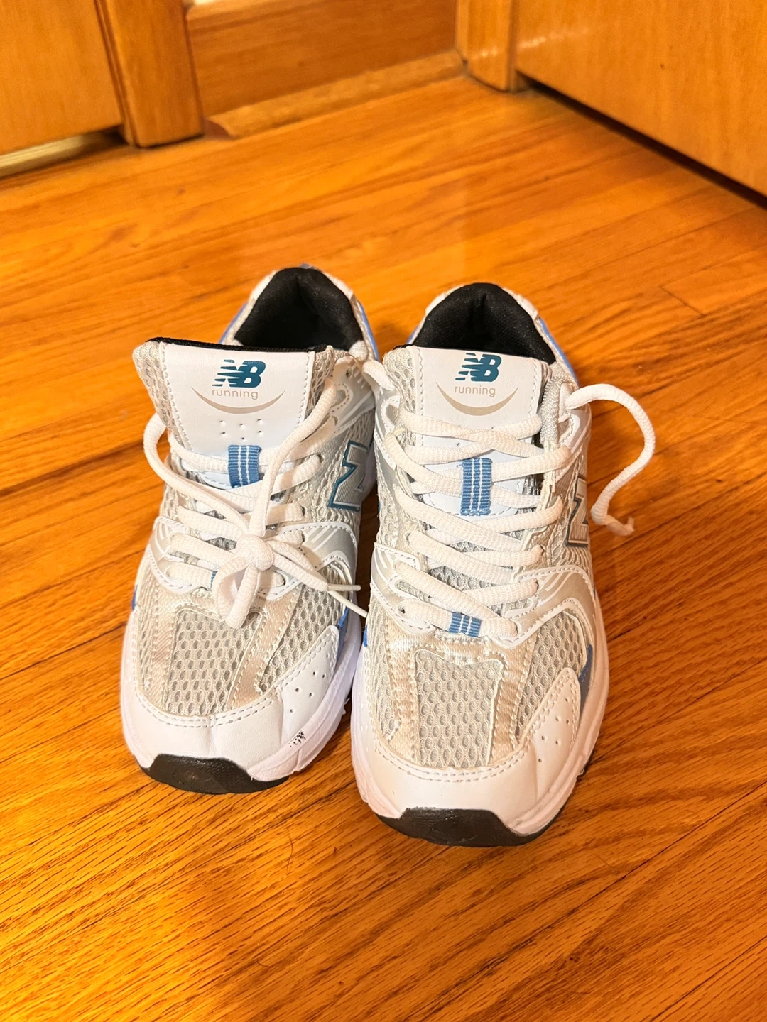Selling a pair of New Balance 530 running shoes in US size 5.5! These are in great shape and ready for a new home. They're white with blue accents, perfect for running or everyday wear