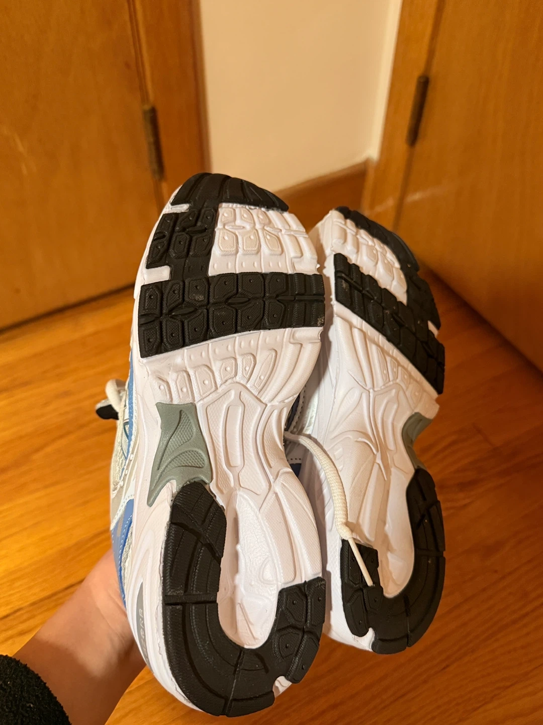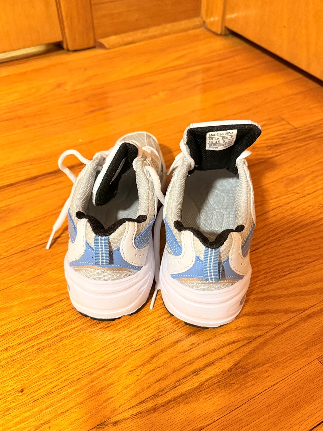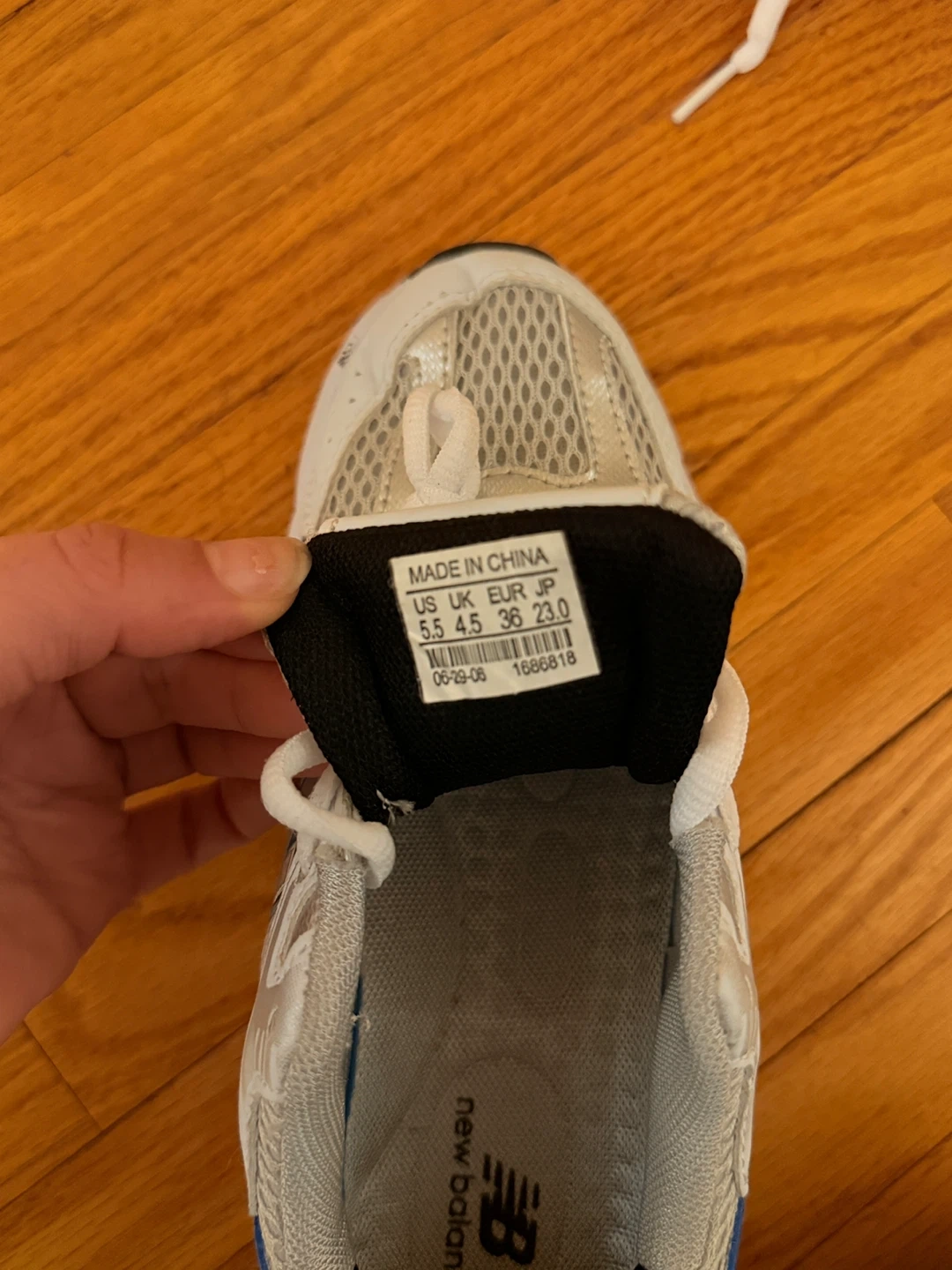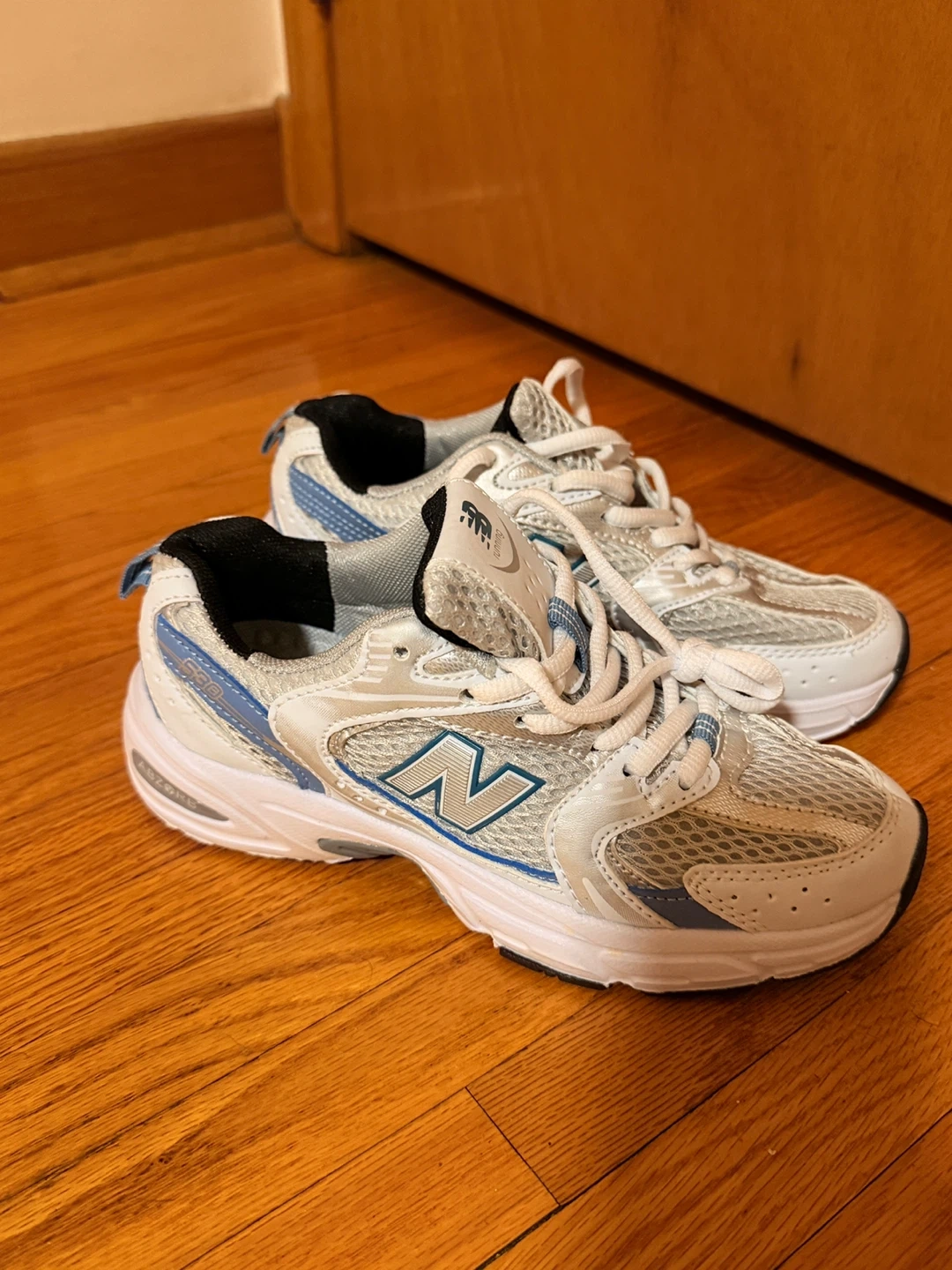 Selling a pair of New Balance 530 running shoes in US size 5.5! These are in great shape and ready for a new home. They're white with blue accents, perfect for running or everyday wear