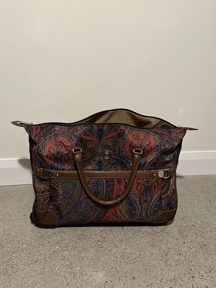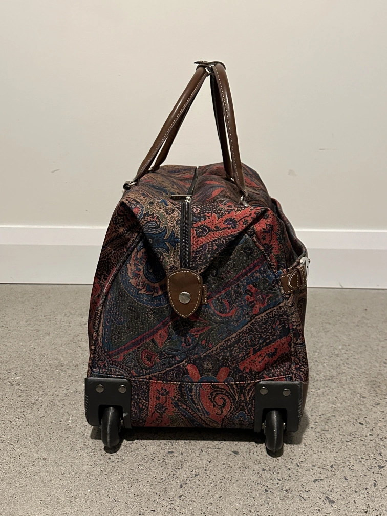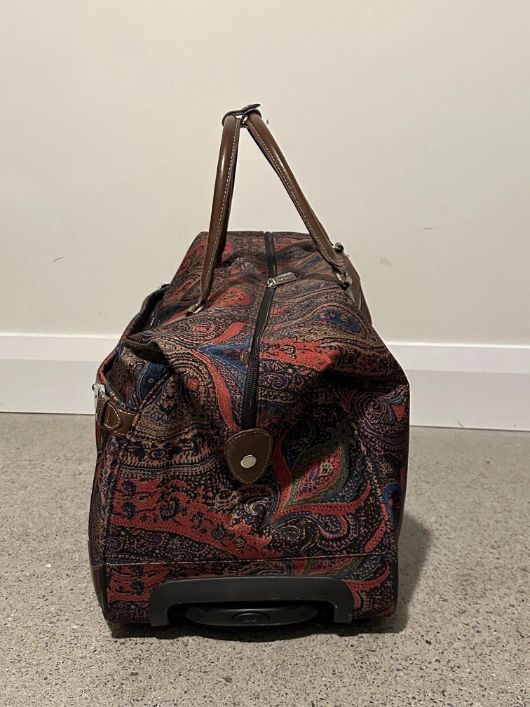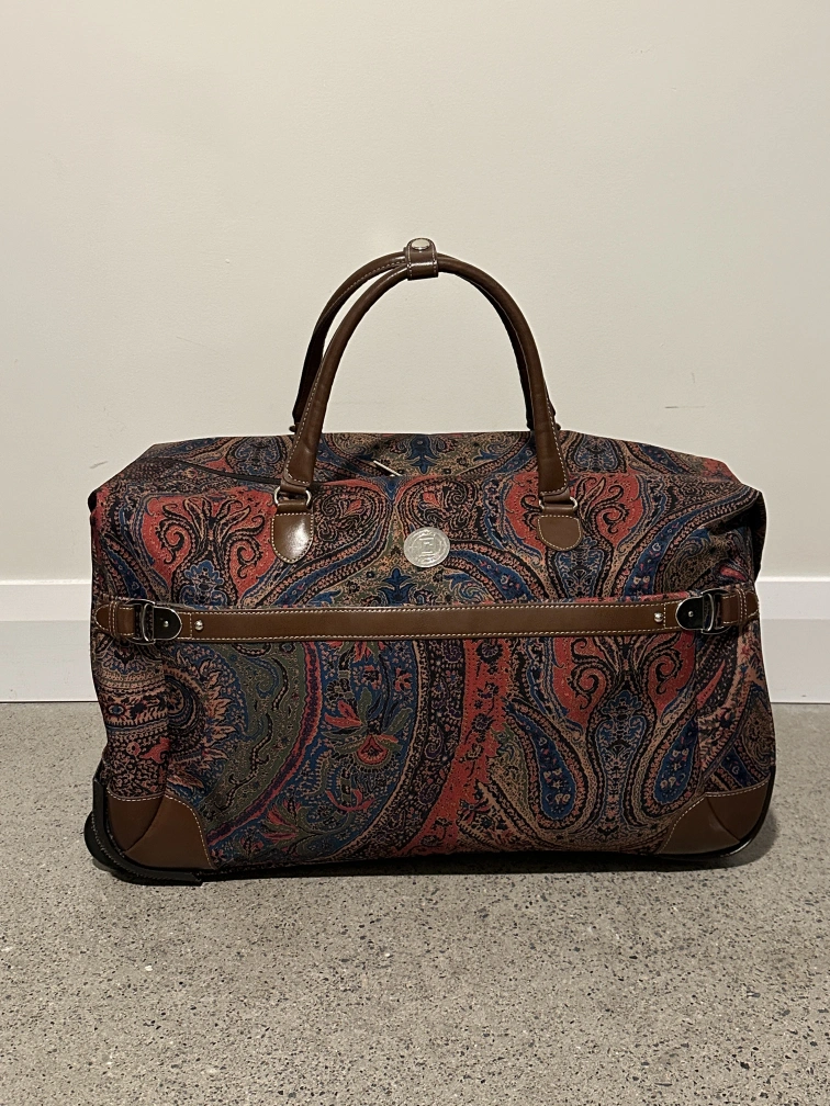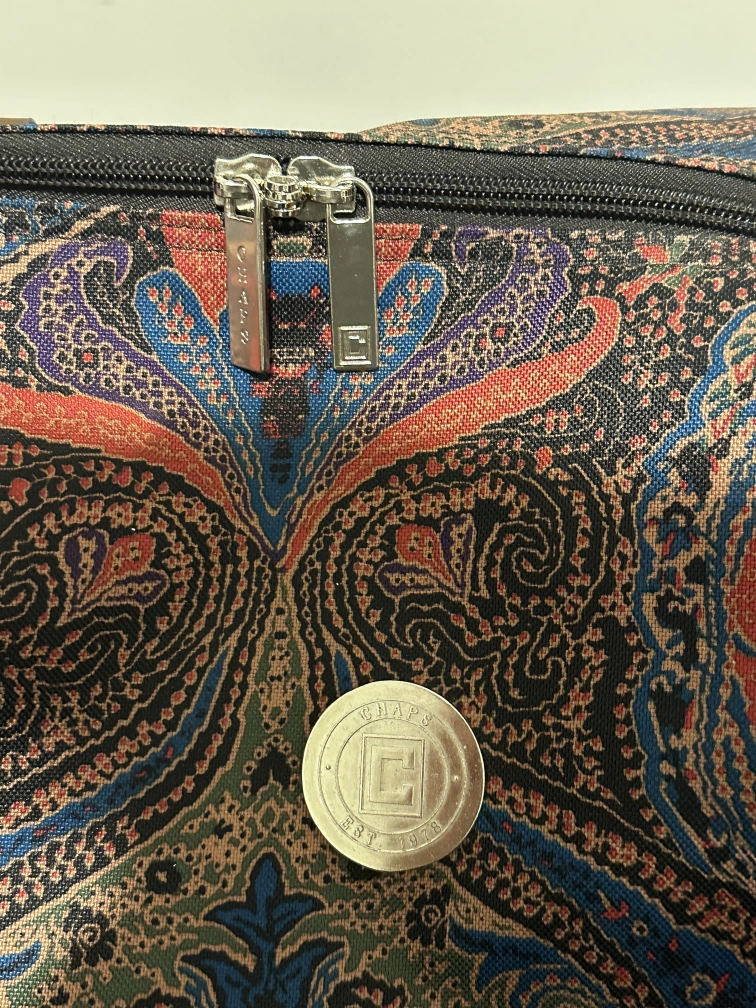 Chaps "Hyde Park Collection" paisley print rolling duffle bag. Has whells and a telescopic handle as well as two brown leather handles.