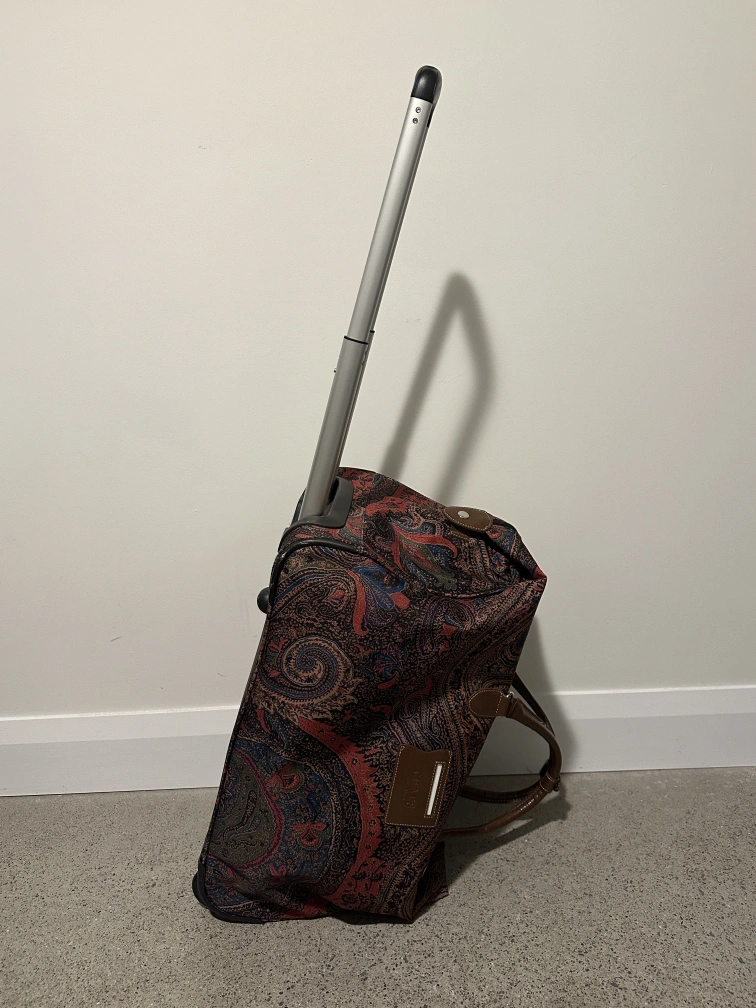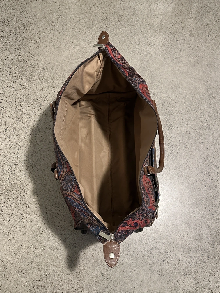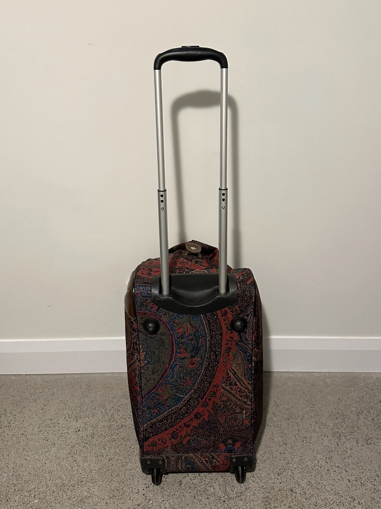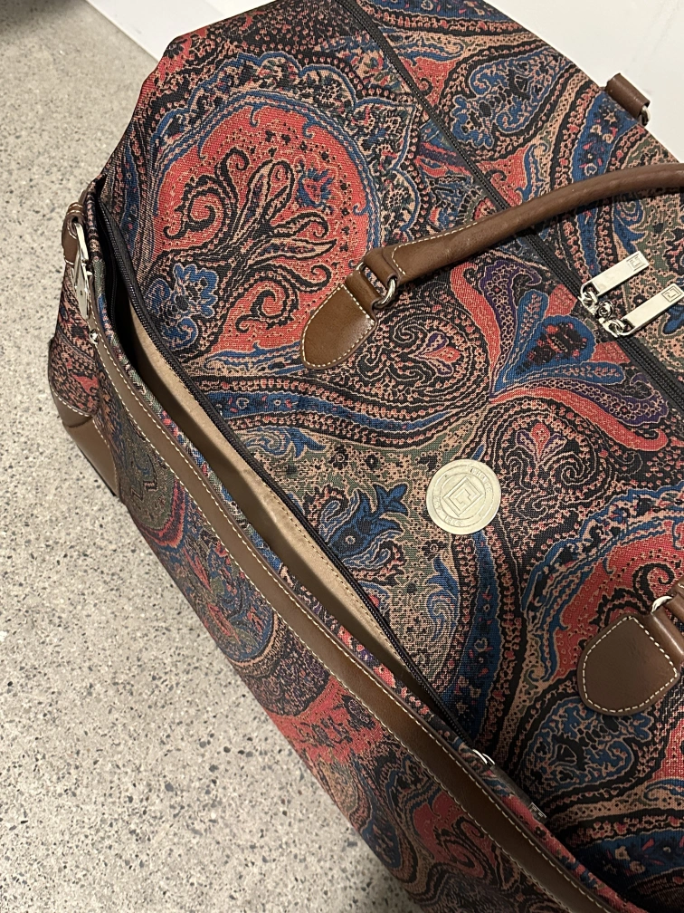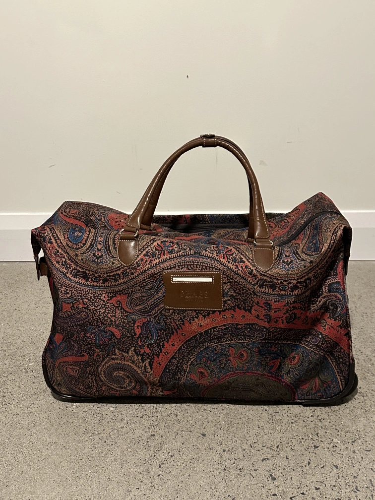Chaps "Hyde Park Collection" paisley print rolling duffle bag. Has whells and a telescopic handle as well as two brown leather handles.