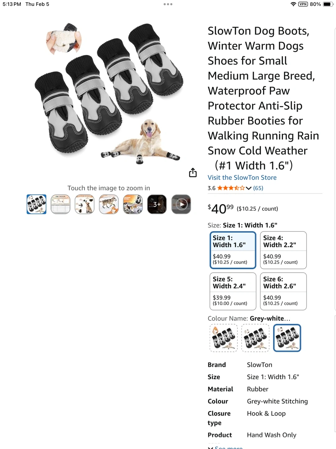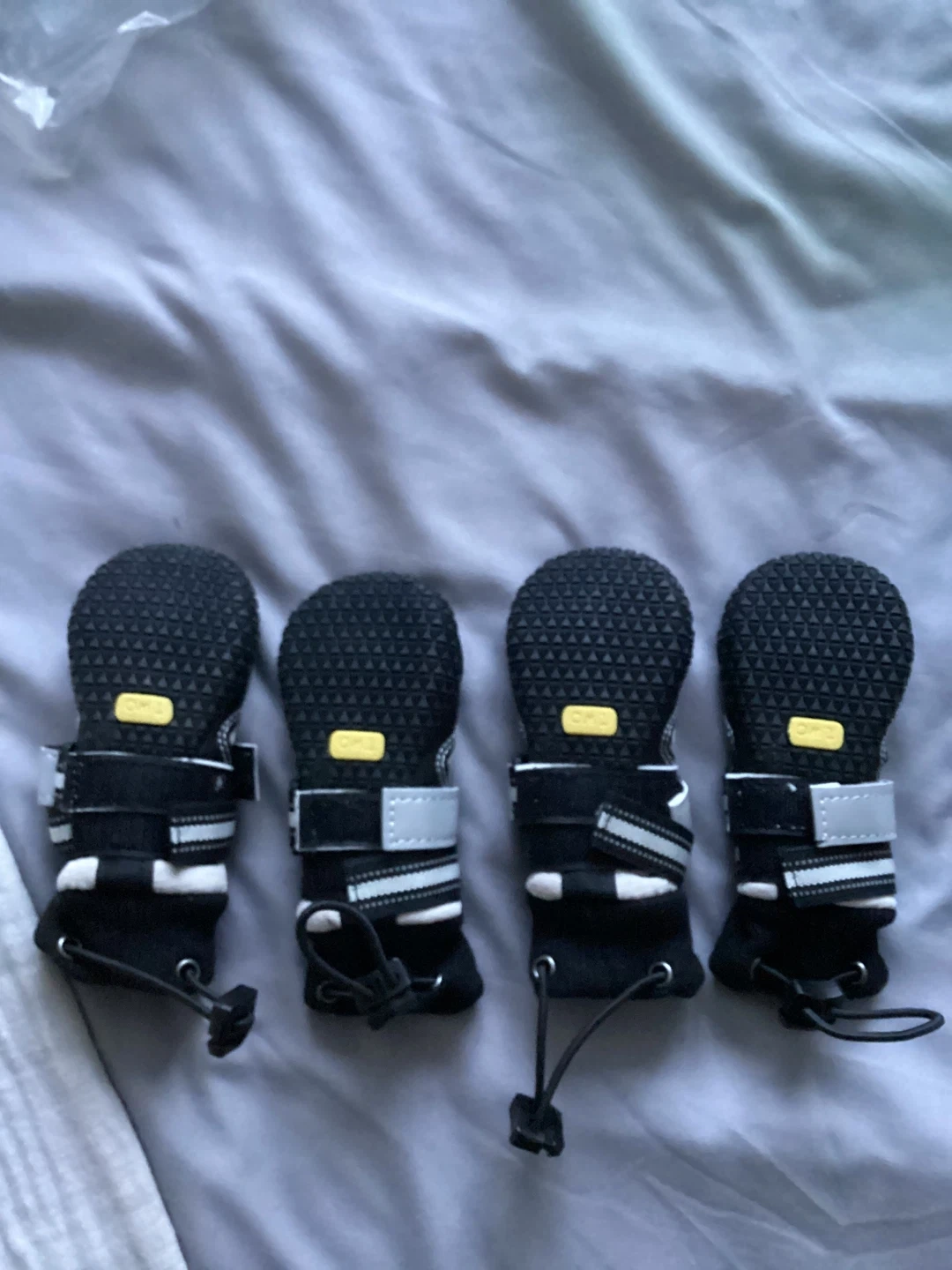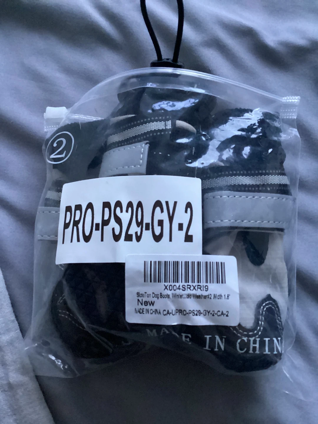 These are SlowTon dog boots for small breeds. They're waterproof and designed for walking in rain, snow, or cold weather. The boots are size 2 made of rubber with grey and white stitching and use a hook and loop closure.