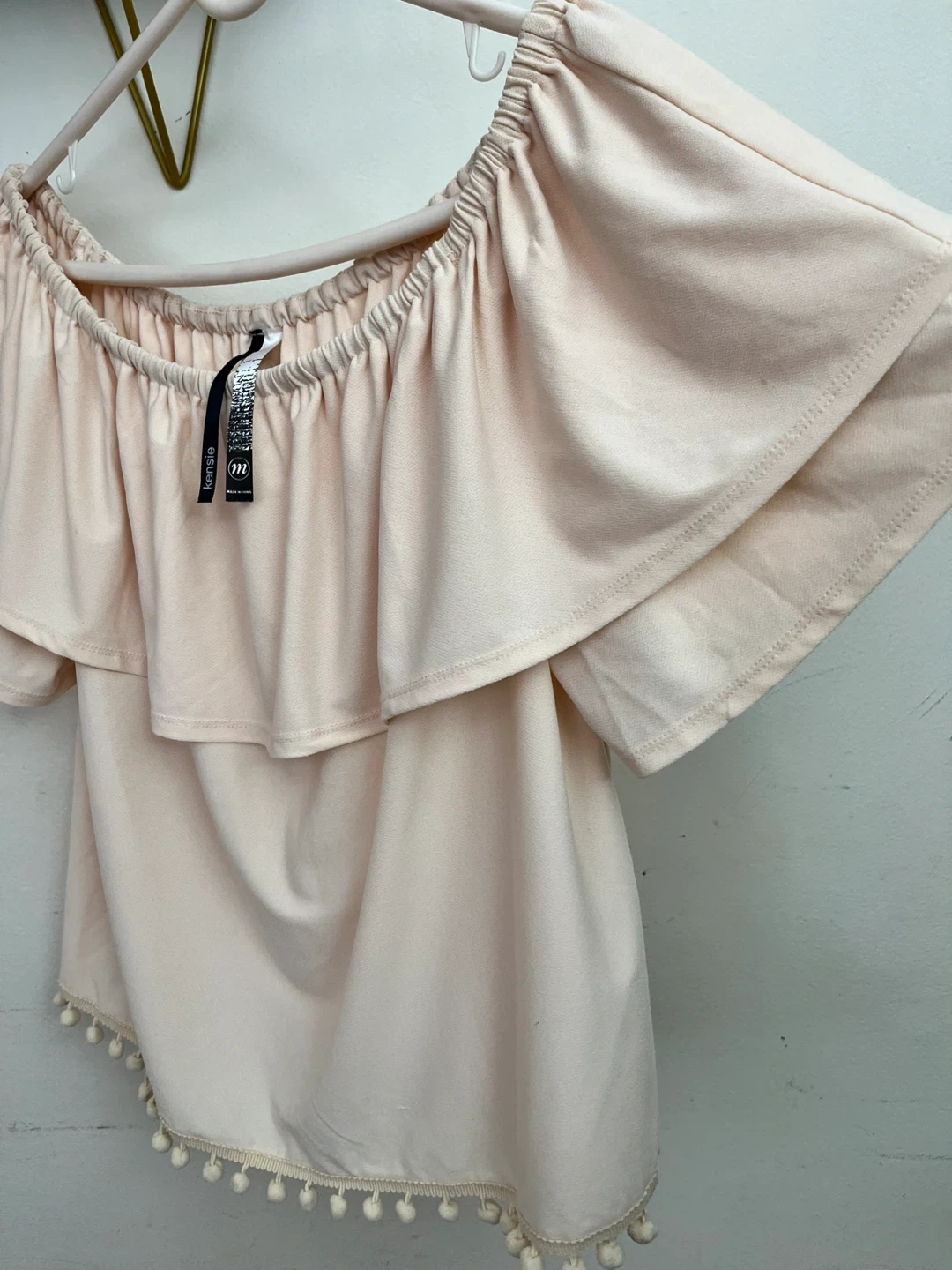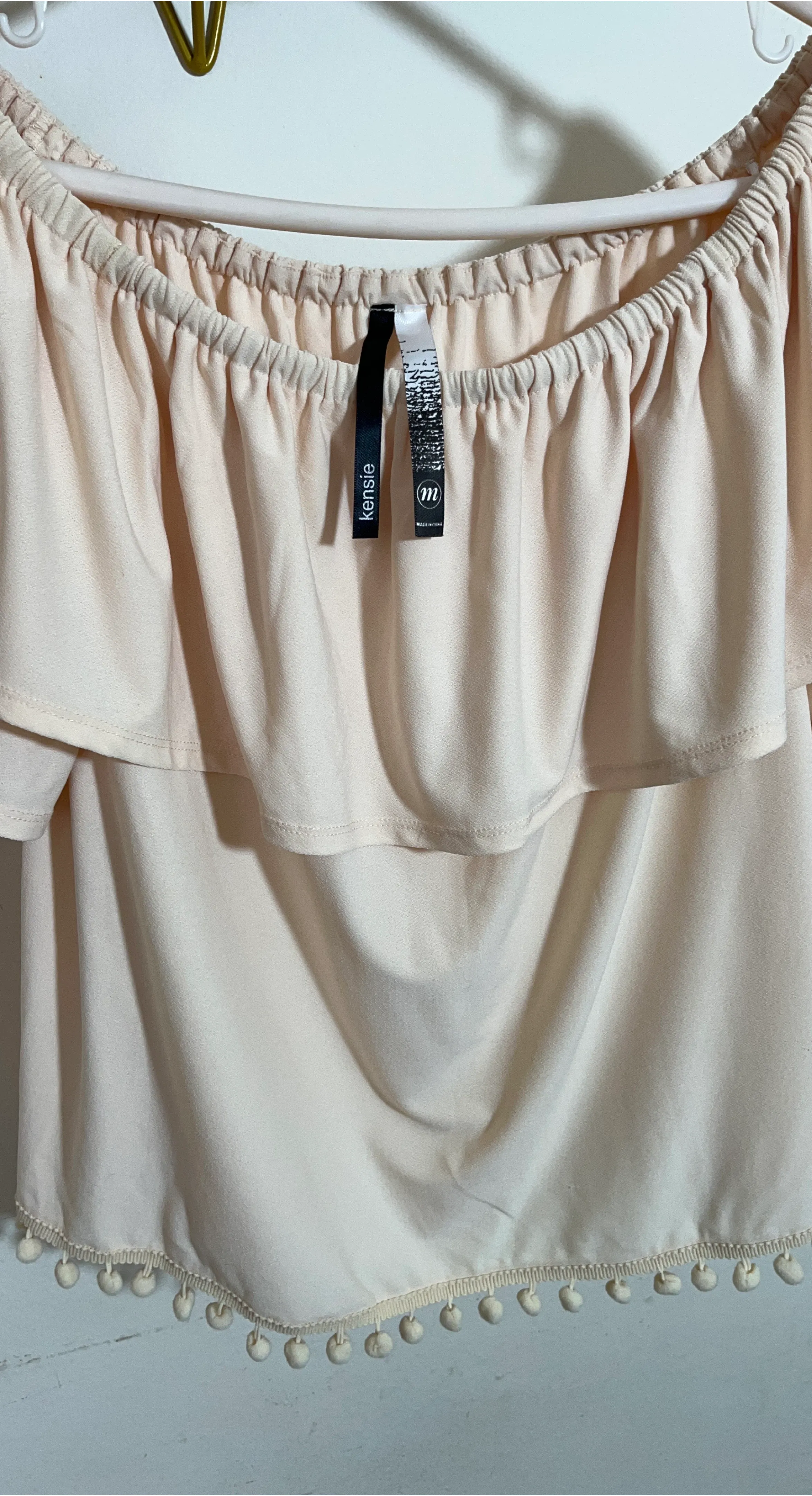 This Kensie off-the-shoulder blouse is a lovely peach color. It features a tiered ruffled design and a playful pom-pom trim along the hem. Made from a soft fabric, it's perfect for warm weather occasions!