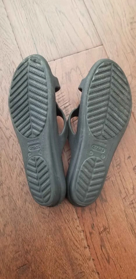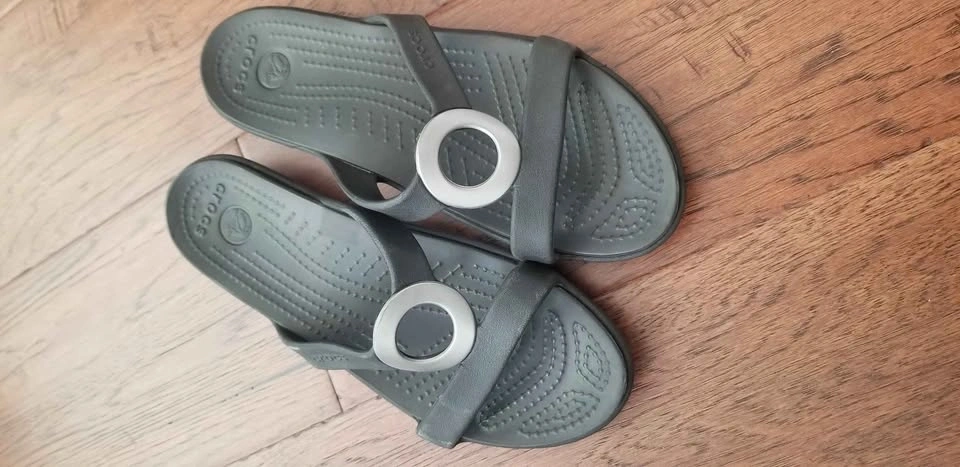 Comfy Crocs dark grey slide sandals with a cool silver ring accent on the straps. Made with classic Crocs material, super easy to wear. Size W 8. See pictures for conditions. As is. Meeting location aldergrove library parking lot. I only hold items when you're on your way.
