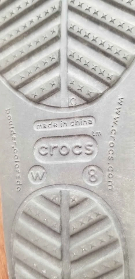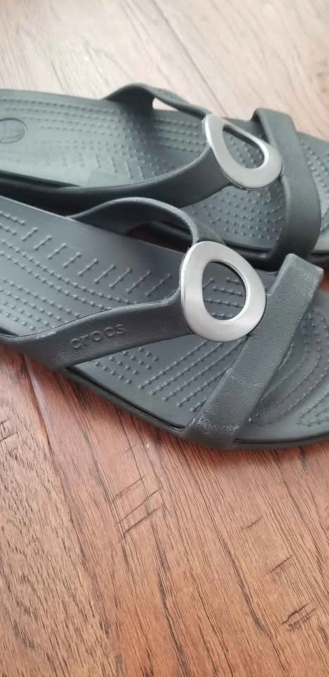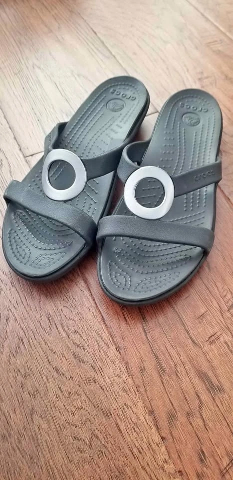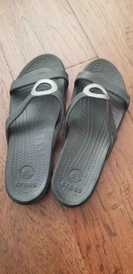 Comfy Crocs dark grey slide sandals with a cool silver ring accent on the straps. Made with classic Crocs material, super easy to wear. Size W 8. See pictures for conditions. As is. Meeting location aldergrove library parking lot. I only hold items when you're on your way.