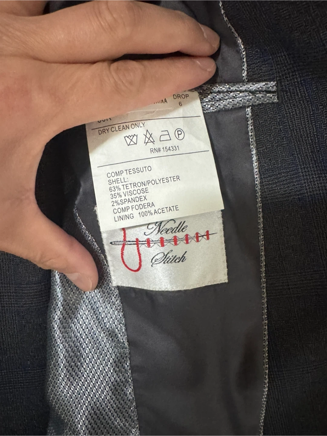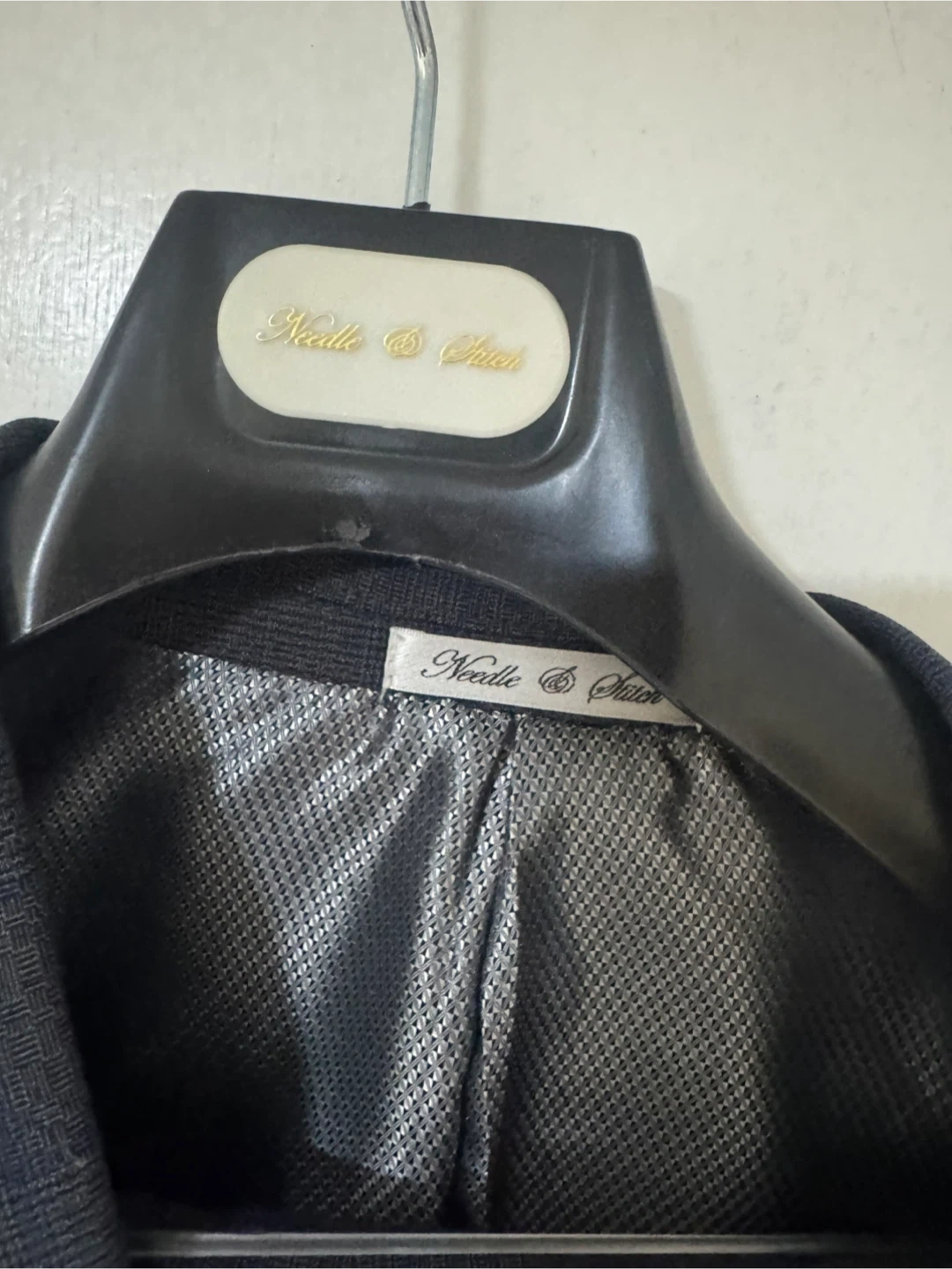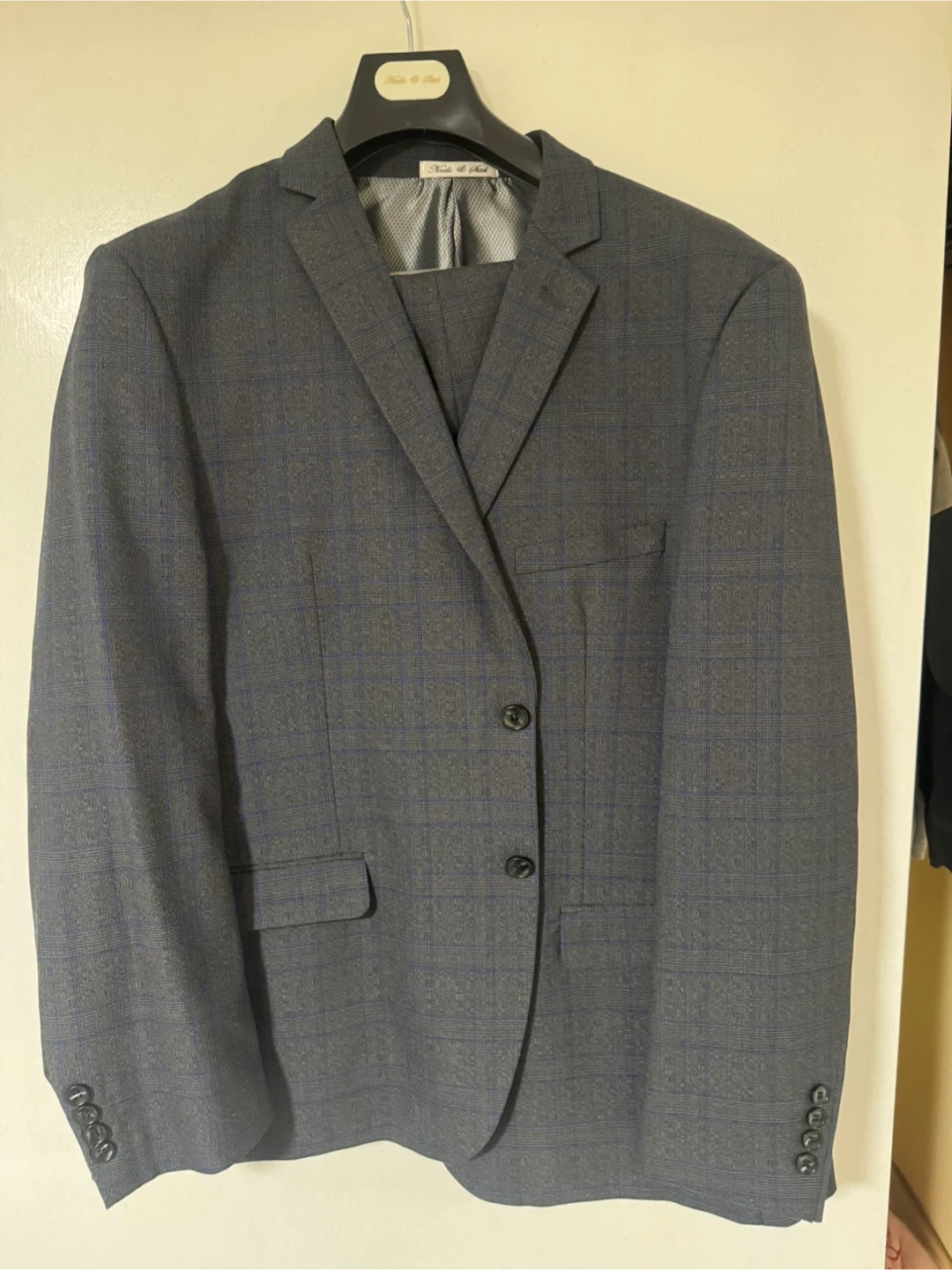 A dark navy blue 3-piece suit set. Includes a suit jacket, vest, and pants. Material appears to be a wool blend. Comes with a garment bag.