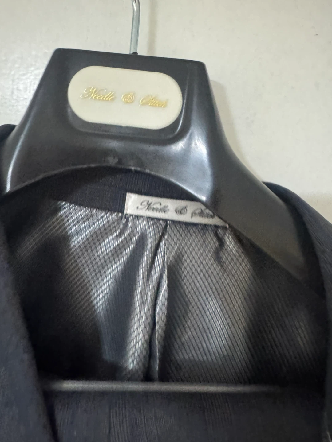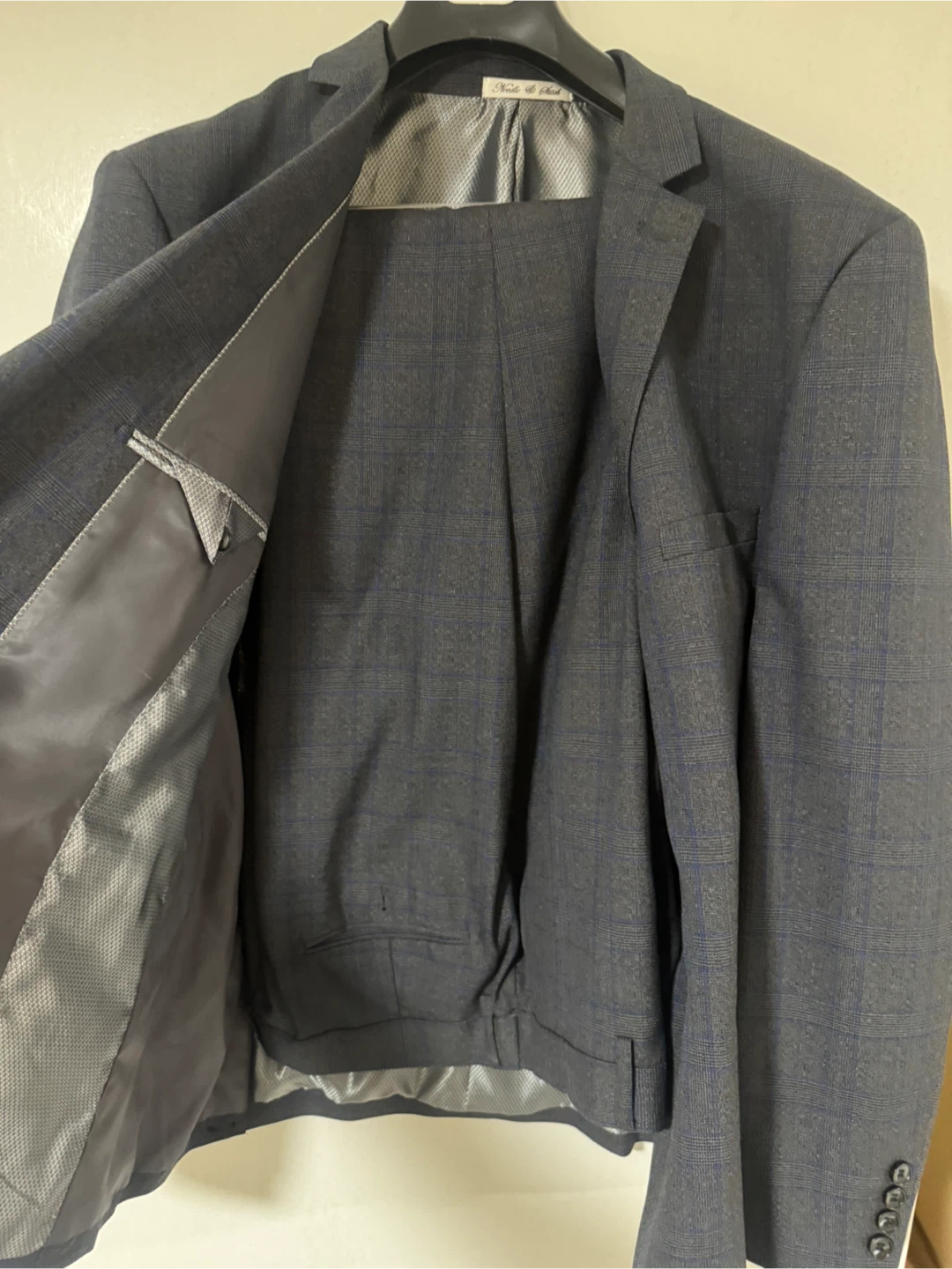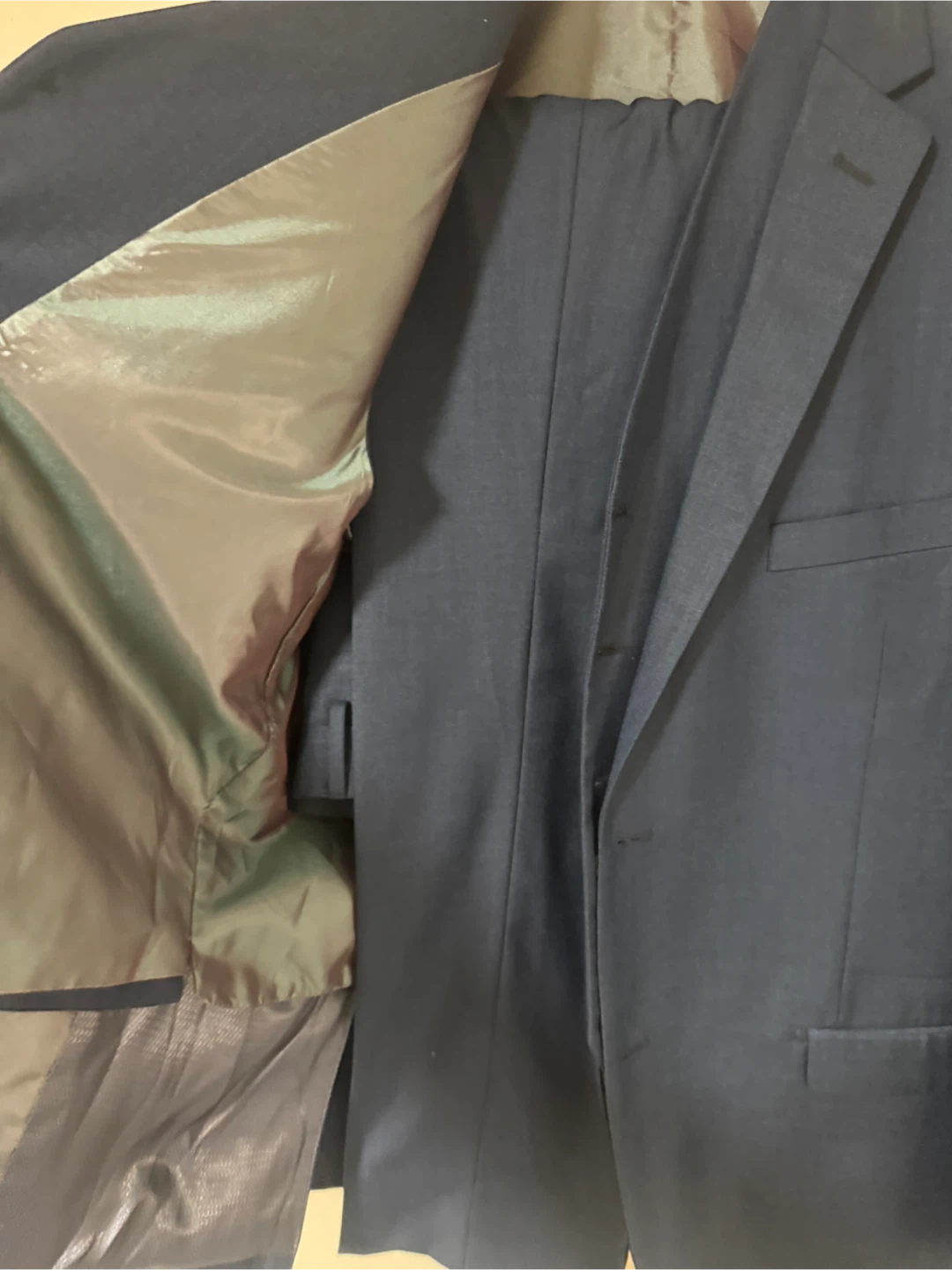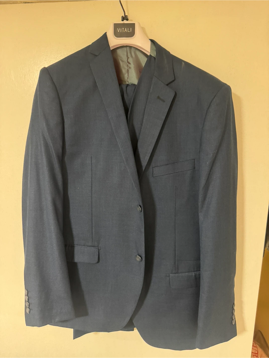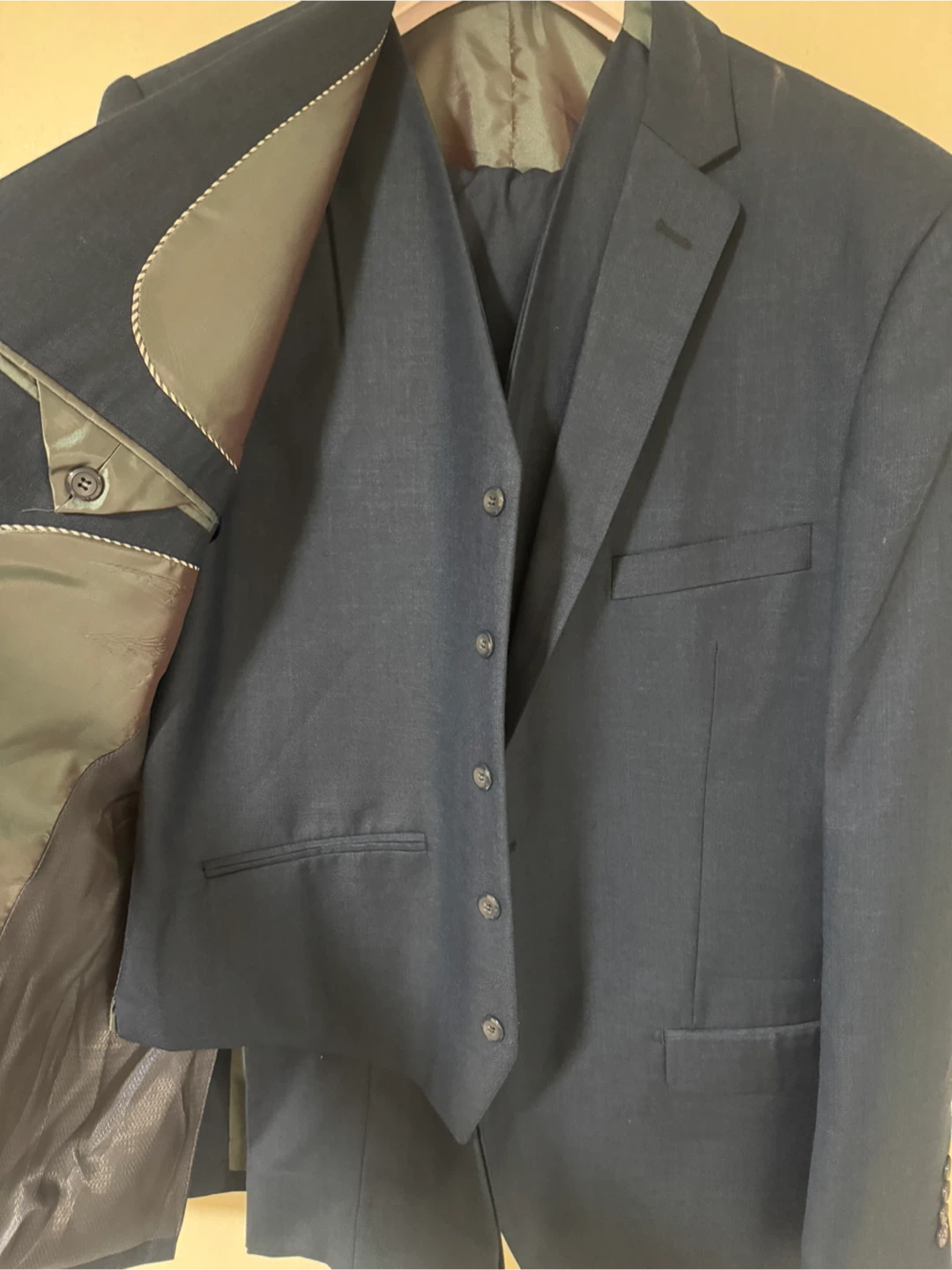 A dark navy blue 3-piece suit set. Includes a suit jacket, vest, and pants. Material appears to be a wool blend. Comes with a garment bag.