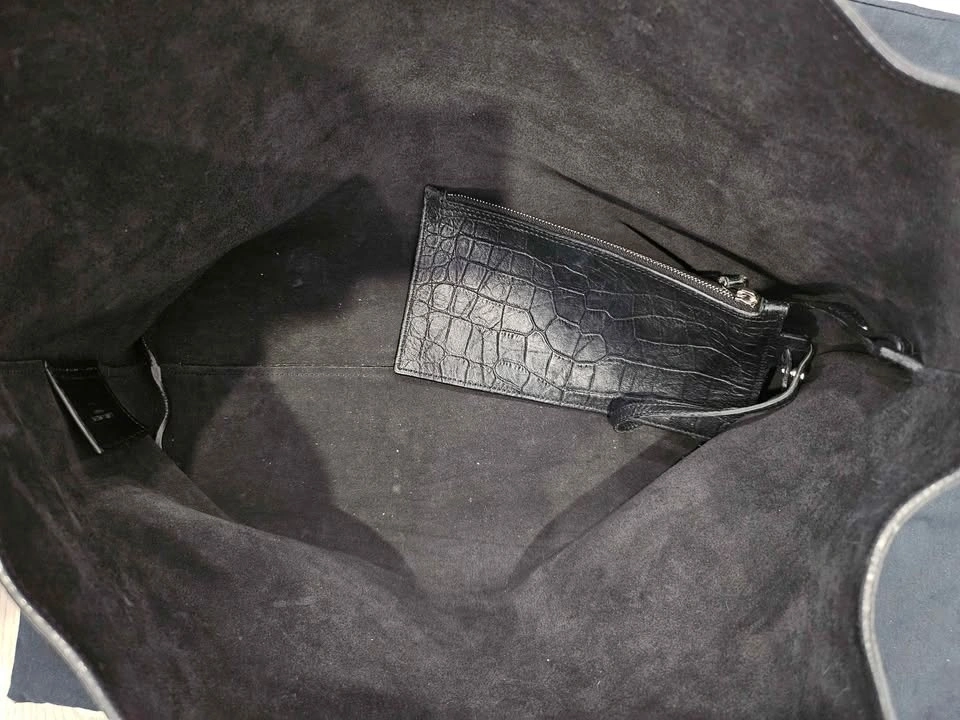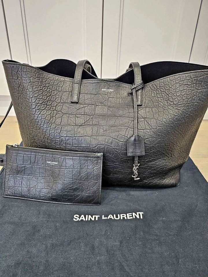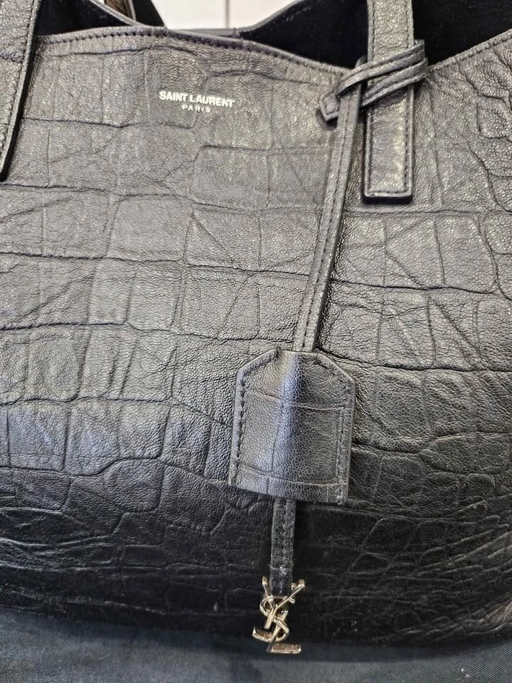 YSL Saint-Laurent Shopping Tote in black leather with an embossed croc pattern. Features a Cassandre charm and a detachable interior zipped purse. Silver hardware with a magnetic snap tab closure. Made of calfskin leather. Dimensions: 14.5 x 11 x 5.1 inches. Handle drop: 9.2 inches. In great condition with very little use. Pick up in Markham.